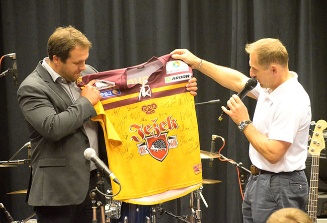 „Pan Křivský (obchodní ředitel pivovaru Jihlava – pozn. aut.) mi celou dobu stál po boku. Zastupoval firmu, která se velmi výrazně podílela na způsobu, jakým jsme prošli a dokázali postoupit do extraligy. Pan Křivský zastupuje pivovar Ježek, který se stal generálním partnerem krátce po mém nástupu do funkce jednatele Dukly. Chtěl bych mu za to opravdu moc poděkovat. Dostali jsme se do extraligy, kde platí trošku jiná pravidla, jiné zákonitosti a vztahují se na nás i smlouvy uzavřené pro celou extraligu. Takže v této chvíli Dukla Jihlava musí ukončit spolupráci s pivovarem Ježek, byť je mi to nesmírně líto. To je důvod, proč jsem sem pana Křivského pozval a mám pro něj malý dárek, kterým chceme poděkovat a vyjádřit přesvědčení, že není všem dnům konec a dále spolu budeme nějakým způsobem komunikovat. Jde o dres, který hráči podepsali bezprostředně po postupu do extraligy, ještě s logem Ježka,“ pronesl Bedřich Ščerban děkovnou řeč.
