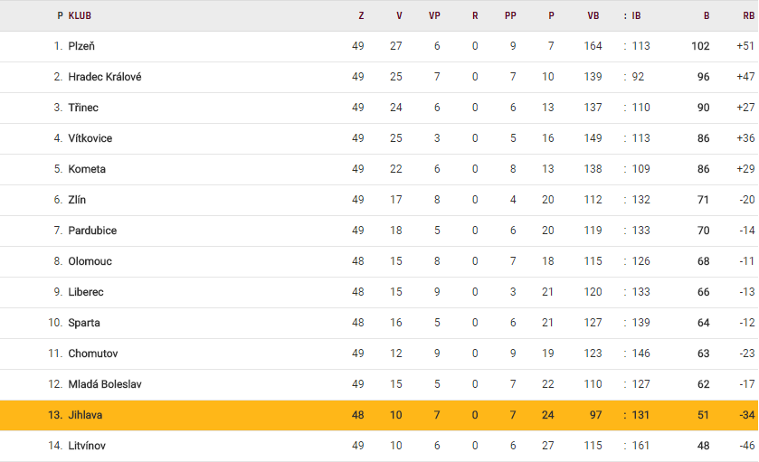 HC Dukla Jihlava: Vejmelka – Suchánek, de la Rose, Zdráhal, Stříteský, Kajínek, Šidlík, Bryhnisveen – Hamill, Skořepa, Kubalík – Jiránek, Zeman, Čachotský – Anděl, Hlinka, Žálčík – Diviš, Hubáček, Rabbit
