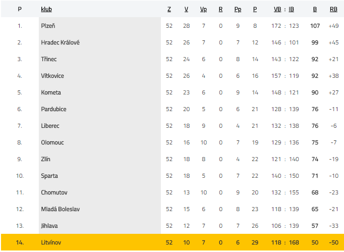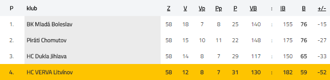 Letošní sezonu si určitě Verva představovala jinak. Zdvižený prst ukázala první čtvrtina soutěže, kdy Verva z dvanácti zápasů vyhrála pouze dva. Renomé si částečně spravila následnou sérií vyhraných pěti zápasů ze šesti. Druhou polovinu základní části by ale nejraději vymazali hráči z paměti. Vždyť ze 26 utkání vyhráli pouze šest! Přitom to na konci roku 2017 vypadalo dobře. Severočeši si drželi náskok devíti bodů na poslední Duklu. Jenže utkání v Jihlavě na začátku roku vše změnilo. Hosté nestáhli náskok Dukly, prohráli 4:5 a od té doby Jihlava bodovala častěji, nakonec skončila třináctá. Po 38. kole navíc přišla změna trenérů, vedení se rozhodlo odvolat Radima Rulíka, místo něj nastoupil legendární obránce přezdívaný „Guma“. Tedy nikdo jiný, než Jiří Šlégr. Rulík si našel angažmá ve Spartě, jako pravá ruka trenéra Výborného. Ani pod Šlégrem se Litvínovu nedařilo, sérii 14 zápasů bez výhry ukončila Benzina až v 47. kole doma proti Boleslavi. Play-out tak bylo fakticky formalitou. Litvínov jako jasný účastník baráže porazil dvakrát Jihlavu, jednou v derby Chomutov. V baráži je zatím „Cheza“ stoprocentní, doma porazila Vary 3:1, venku Kladno 2:1.