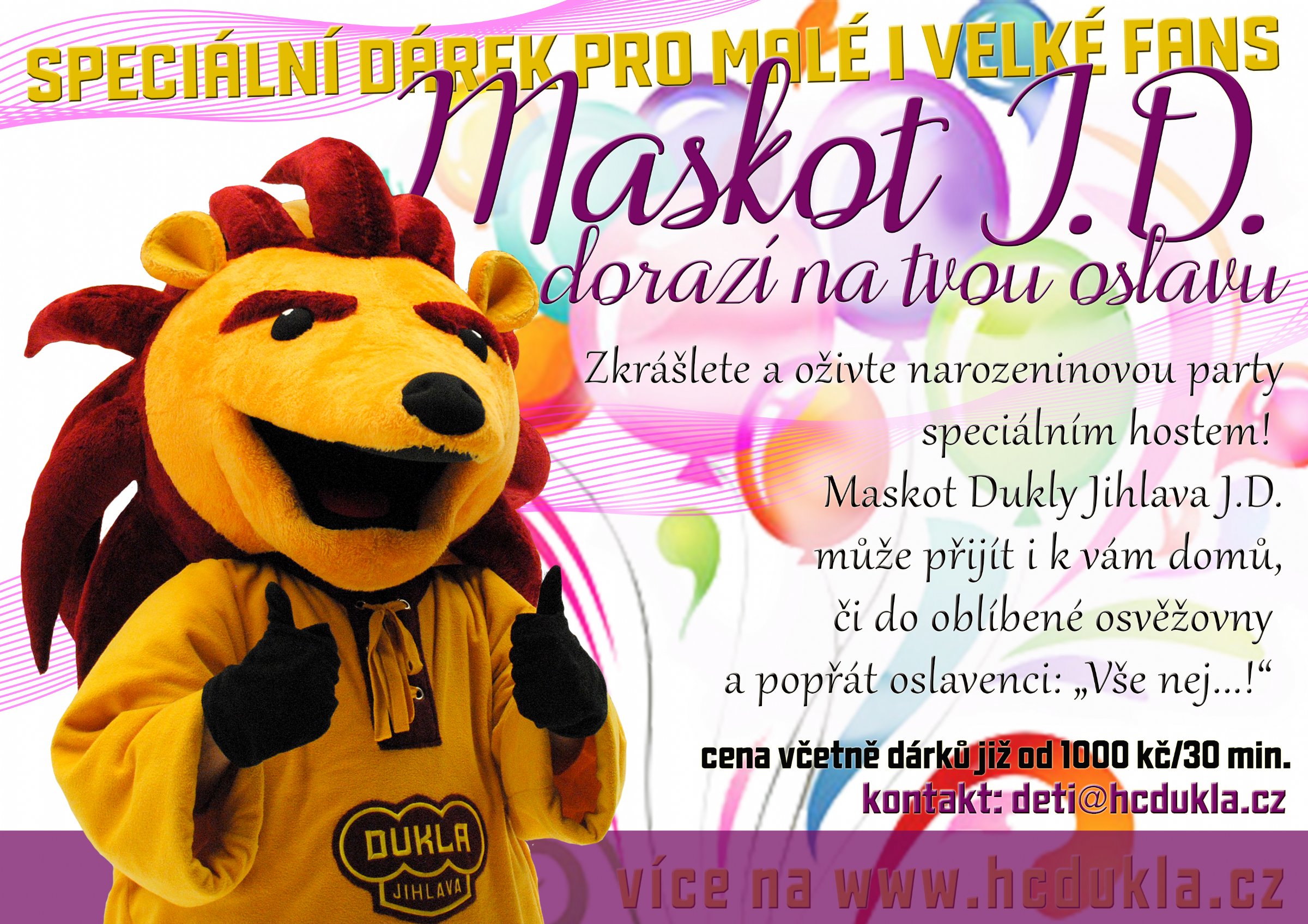 „JD je živel a nezkazí žádnou dětskou oslavu. Na řadě akcí ve školkách nám děti řekly, že půjdou na hokej jen kvůli němu. Pozvat ho můžete i na firemní večírky, maturitní plesy, zábavy i jinam,“ vyzývá PR manažer Dukly Jihlava Zdeněk Drla.