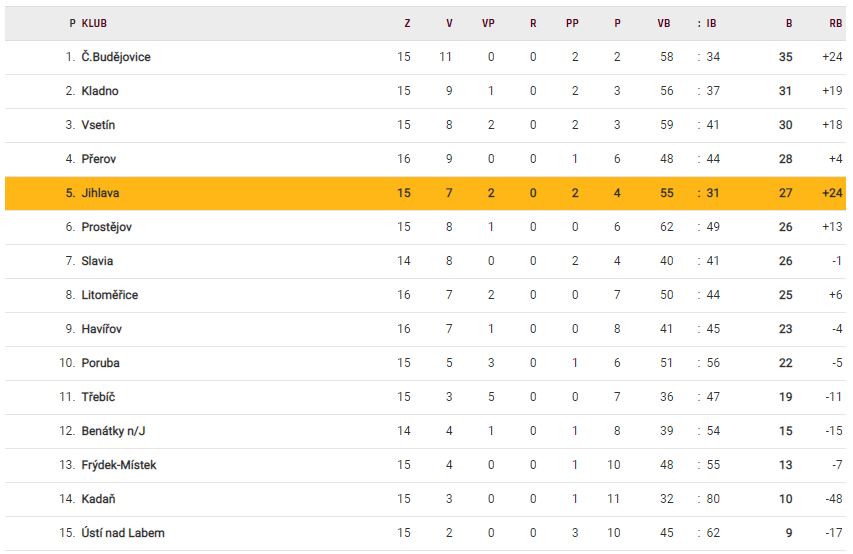Také Motor jede na slušné výkonnosti. V prvních sedmi kolech prohrál jediný zápas, když v Jihlavě podlehl 0:7. Připsali si i dvě výhry s nulou – doma proti Slavii (5:0) a proti dalšímu celku s velkými cíli Kladnu (3:0). Poté přišlo období pěti zápasů, kdy Jihočeši trošku vypadli z rytmu, neboť třikrát prohráli (dvakrát na nájezdy) a dvakrát brali tři body. Ovšem v posledních třech zápasech – stejně jako Dukla – neztratili ani bod. Motor zvládl daleký trip do Frýdku-Místku (5:2), doma doslova rozcupoval Porubu výsledkem 8:1 a ve vsetínském peklu vyhráli svěřenci trenérů Václava Prospala a Aleše Tottera 3:2. České Budějovice jsou aktuálně na prvním místě tabulky s 35 body a čtyřbodovou ztrátou na druhé Kladno s výborným skóre 58:34 (spolu s Duklou nejlepší skóre v lize dle vstřelených a obdržených branek).