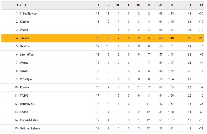 Jestliže Dukla nabírá na formě a dle posledních pěti zápasů jí patří v tabulce druhé místo (za vedoucím Motorem), Rytíři ve sbírání bodů nyní lehce polevili. Pokud vezmeme v potaz předešlých 10 zápasů, jsou sice v tabulce druzí se ziskem 21 bodů z 30, ale pouze šest z nich získali ve druhé polovině října. Od porážky na ledě Motoru (0:3) vyhráli Kladenští pět zápasů po sobě, přičemž dvakrát nedostali ani branku a třeba z Ústí dovezli vítězství 8:4. Jenže jejich rozlet byl pozastaven v Litoměřicích (2:3). Následovala sice divoká výhra 6:5 v prodloužení na ledě Frýdku-Místku, ale poté Kladno padlo v Porubě 2:5. Z těžkého vsetínského prostředí si domů dovezlo bod za nájezdovou porážku a zpět na tříbodovou vlnu se vrátilo v posledním kole doma s Benátkami – 5:1. Sečteno a podtrženo, Kladno je nyní na druhém místě s 35 body, jenže v tabulce nejsou žádné velké rozdíly, vždyť třeba osmá Slavia (se zápasem k dobru) ztrácí na Rytíře jen pět bodů.