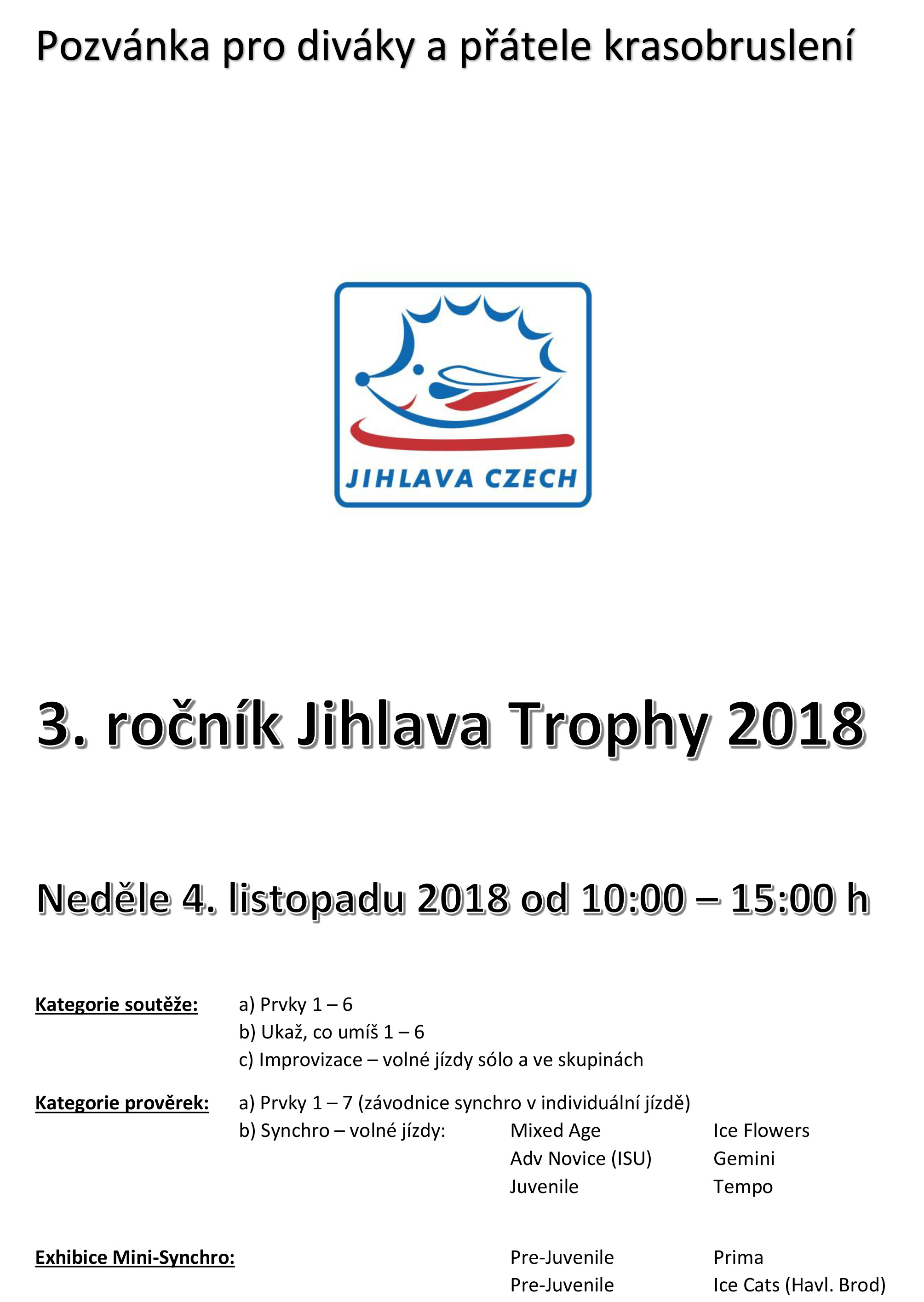 S pozvolným nástupem zimního počasí přichází čas krasobruslařských soutěží. Jedna z nich se uskuteční v neděli 4. listopadu 2018 na Horáckém zimním stadionu v Jihlavě, kde proběhne již 3. ročník Jihlava Trophy. Soutěžit se bude od 10 do 15 hodin. Všechny diváky a přátele krasobruslení srdečně zve do hlediště oddíl synchronizovaného krasobruslení Dukla Jihlava – mládež. Přijďte se podívat na bruslařský um závodnic na vlastní oči.