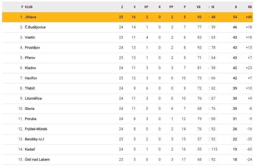I díky tomuto počinu se Vsetínští dostali na 2. místo tabulky, jenže v posledních zápasech střídají vítězství s porážkami. Před repre pauzou totiž i podruhé prohráli s Havířovem, poté doma skolili Ústí nad Labem, aby následně prohráli v Třebíči 2:6. Po Karjala Cupu Vsetín těsně prohrál na ledě Frýdku-Místku po přestřelce 4:5. Dvě porážky za sebou kompenzovali zelenožlutí v posledních dvou utkáních, kdy 5:4 vyhráli v Porubě a z benáteckého ledu si dovezli vítězství 4:1 (stejně jako Dukla). Aktuálně tak Vsetín patří na třetí místo tabulky se 43 body a na potrestaný Motor ztrácí jen tři body. Dukla má naopak na VHK ROBE náskok 11 bodů, ale také dva odehrané zápasy navíc.