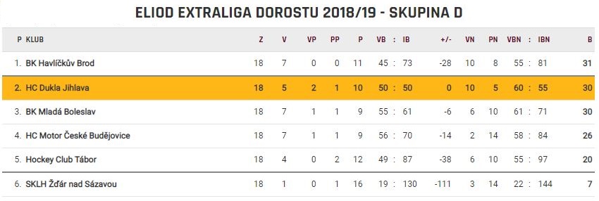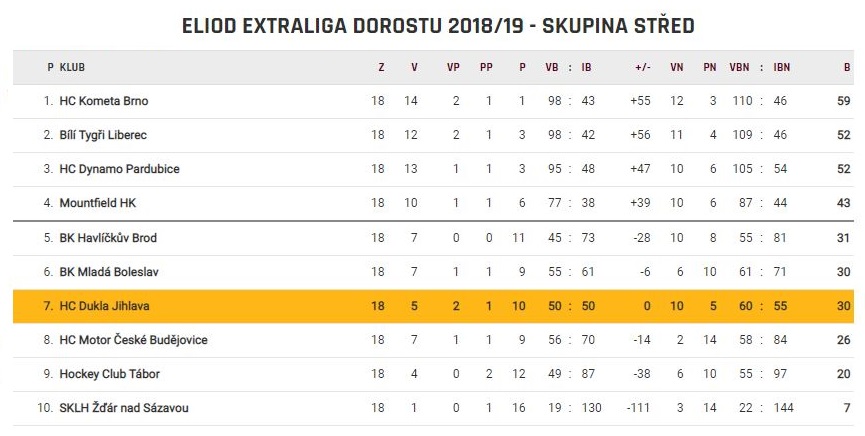 Není třeba se za nic skrývat, osmnáctikolová základní část se jihlavskému dorostu nevydařila. Cíl v podobě umístění do čtvrtého místa Dukla nesplnila. Na poslední pozici s jistotou play-off a se zápasy proti těžším soupeřům ztratili červenožlutí třináct bodů, byť už během sezony bylo asi jasné, že se na čtvrté místo nedostanou. Dílčí cíl byl proto přeměněn na udržení pátého místa, což by po “přechodu“ první čtyřky do A-nadstavby znamenalo start bojů o play-off z prvního místa. „Ani to se nám bohužel během posledních dvou utkání nepovedlo a nakonec jsme skončili až sedmí, s čímž je ze strany trenérů hodně velká nespokojenost. Myslím si, že nespokojenost panuje i mezi hráči a kabinou,“ nezastírá neúspěch trenér Štěpán Moravec.