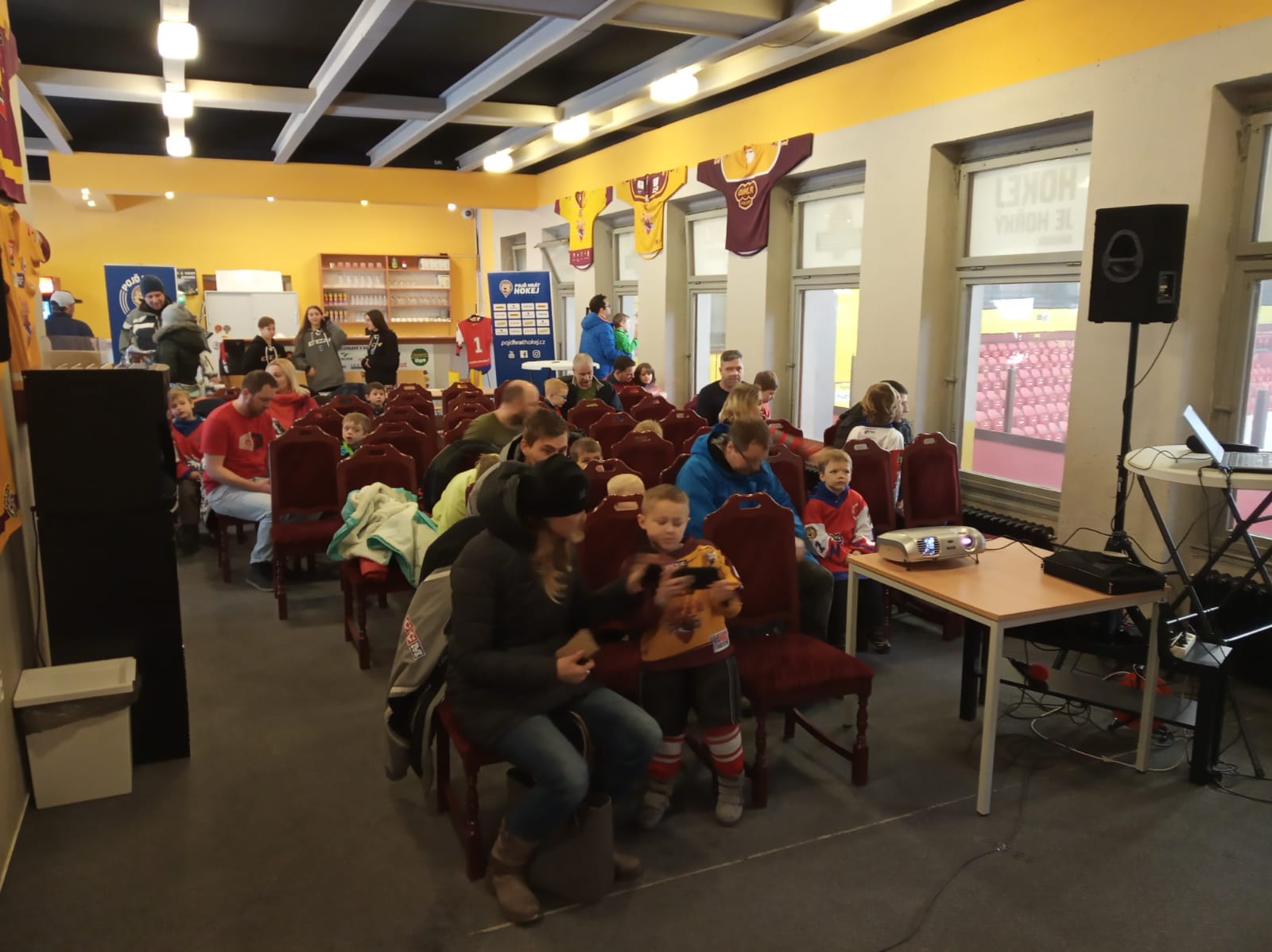 Po registraci dětí, kde největší radost dětem udělaly krásné nové „repre“ dresy, do kterých se většina hned oblékla, ale i další dárky („krekry, magnetky, placky, omalovánky) se rodiče usadili k připravené prezentaci. Při prezentaci, která začala přibližně v 11:00 hodin, se rodiče dozvěděli vše podstatné o chodu našeho klubu, tréninku, výstroji a měli rovněž možnost shlédnout instruktážní videa, jak se učí malý hokejista.