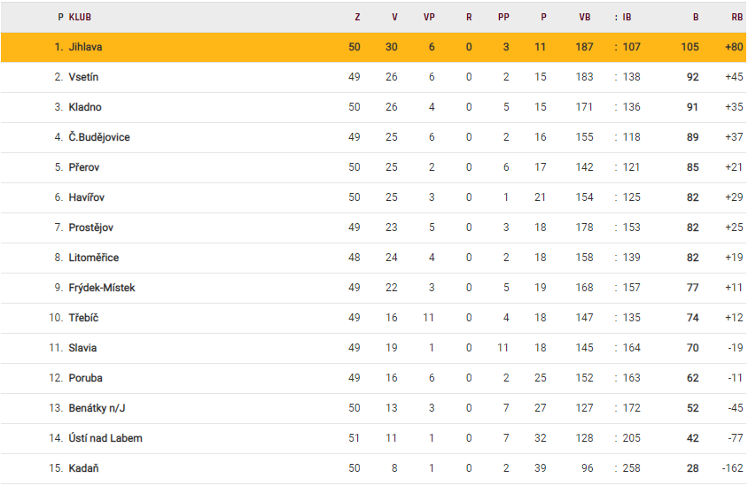 Litoměřice budou v závěru základní části bojovat o to, aby zápas 26. února na ledě Kladna nebyl jejich posledním. Mají k tomu velice dobře nakročeno a celé to mají ve svých rukách, neboť před devátým Frýdkem mají pětibodový náskok. Mnohem vyrovnanější je však situace nad osmým místem. 82 bodů má i Havířov s Prostějovem, o tři body více pak pátý Přerov a s 89 body je čtvrtý Motor. Litoměřice byly dokonce jeden čas i na pátém místě, jenže dvě prohry na Motoru a ve Frýdku-Místku poslaly Stadion na osmé místo. Třetí čtvrtina soutěže se ale dá pro Severočechy označit jako velice úspěšná, neboť z 12 utkání prohrál Stadion pouhé tři! Zejména v posledních třech utkáních ukázal velkou útočnou sílu, v každém zápase vsítil šest gólů, které stačily na výhru. V 51. kole měla dlouhou cestu domů ostravská Poruba, která v Kalich Aréně prohrála 3:6, ten samý výsledek se urodil na vsetínském Lapači, kde Stadion překvapil a neméně dlouhá cesta domů se nesla rozhodně ve spokojenějším duchu, než jakou měla Poruba. Poslední zápas měl drobný nádech derby, Litoměřice v něm uctily památku zesnulého fanouška Adámka Pařízka na výbornou, když porazili Benátky nad Jizerou před 1124 diváky suverénně 6:2.