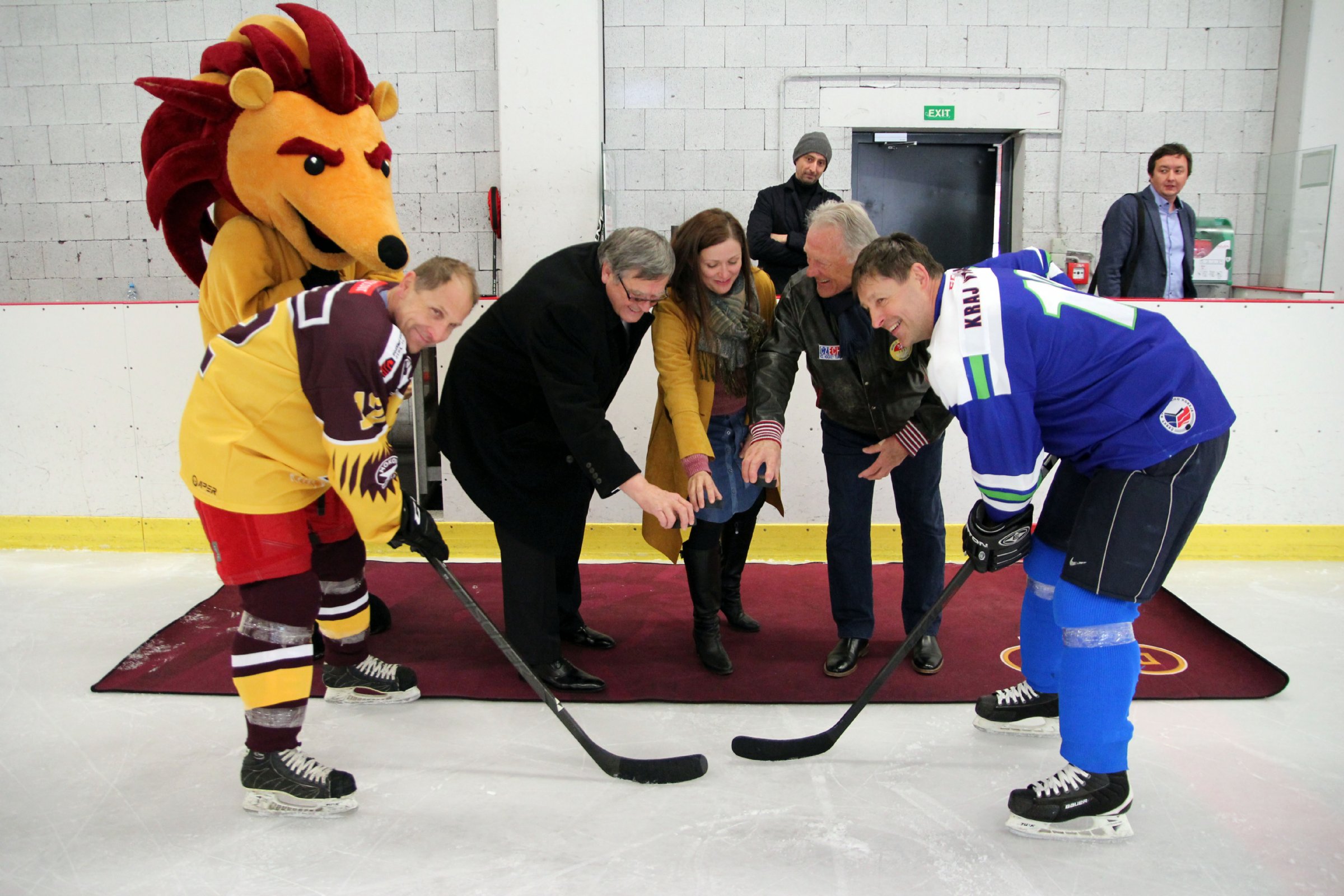 Kapitáni Bedřich Ščerban (vlevo) a Milan Kastner čekají na úvodní buly z rukou Jiřího Běhounka, Karolíny Koubové a Jiřího Holíka.