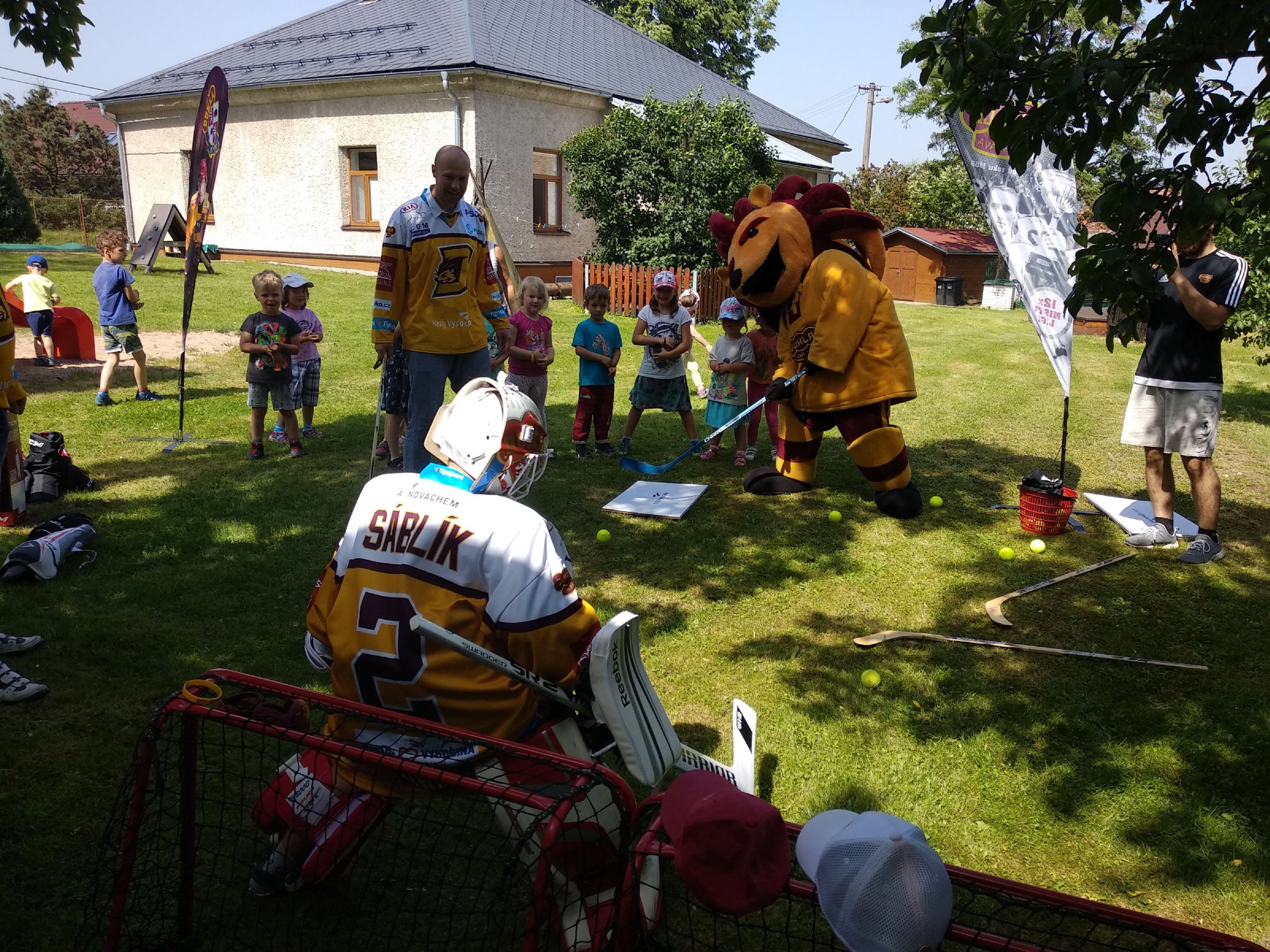 Další návštěva ve venkovské školce, ve Stříteži kousek za Jihlavou, proběhla v minulém týdnu. Opět na všechny čekalo seznámení s hokejovou výstrojí, možnost si jí obléct a vyzkoušet si pohyb v ní i střelecká soutěž. Brankářskou výzbroj si neoblékl jeden z hlavních aktérů těchto aktivit a dlouholetý gólman Dukly Lukáš Sáblík, ale jeden z běžných návštěvníků školky. Přiznal se, že hokej hraje, ale tradičně v hráčském poli. Všechny děti byly skvělé, ale malý duklácký útočník, co si na sebe výjimečně vzal brankářskou výzbroj, byl nepřekonatelný a po výměně stran maskotovi JDýmu zase sázel fíka za fíkem.