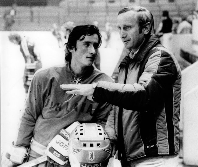 LEGENDÁRNÍ FOTOGRAFIE. Trenér Jan Hrbatý starší udílí ze střídačky pokyny svému synovi Janovi.