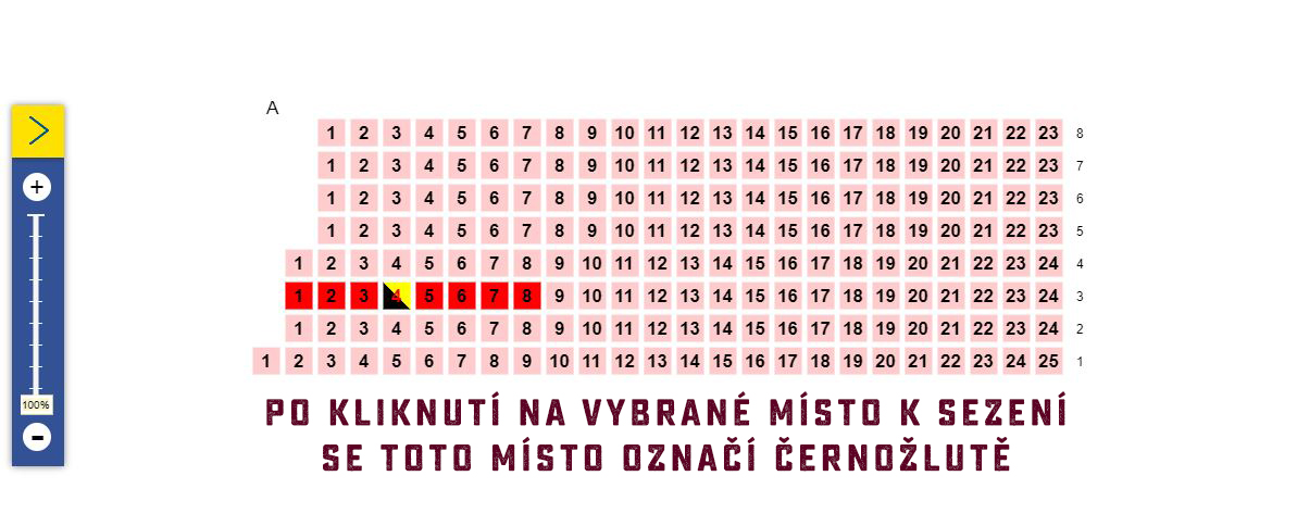 - Jeden uživatel může koupit maximálně 6 vstupenek. V sektorech na sezení je nutné zvolit požadované místo