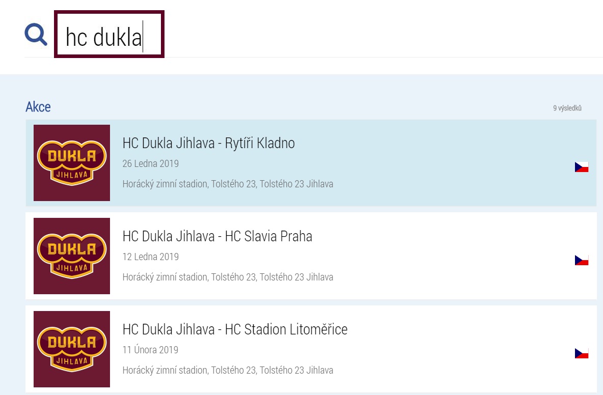 - Na hlavní stránce Ticketportalu najet na tlačítko Hledej a napsat např. HC Dukla