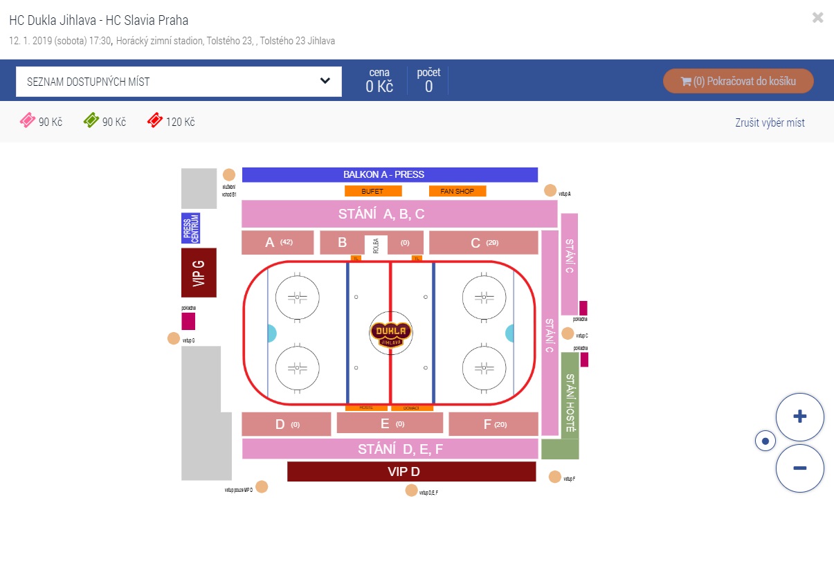 - Po vybrání konkrétního zápasu je třeba kliknout na oranžové tlačítko s ikonkou nákupního vozíku KOUPIT, čímž se uživatel dostane do jednotlivých sektorů Horáckého zimního stadionu