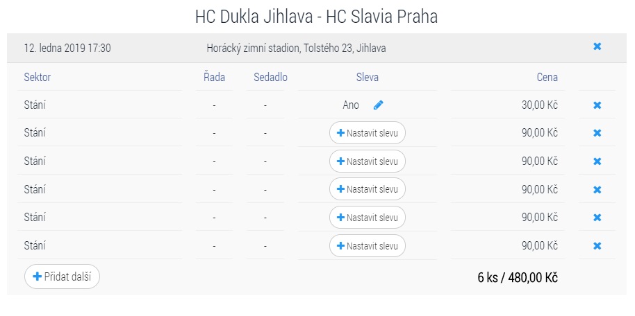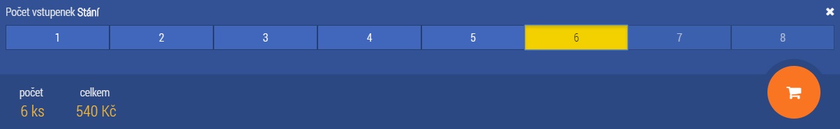 - Při kliknutí do sektoru na stání je v dolním modrém pásu možné zvolit počet vstupenek, opět maximálně šest na jeden nákup