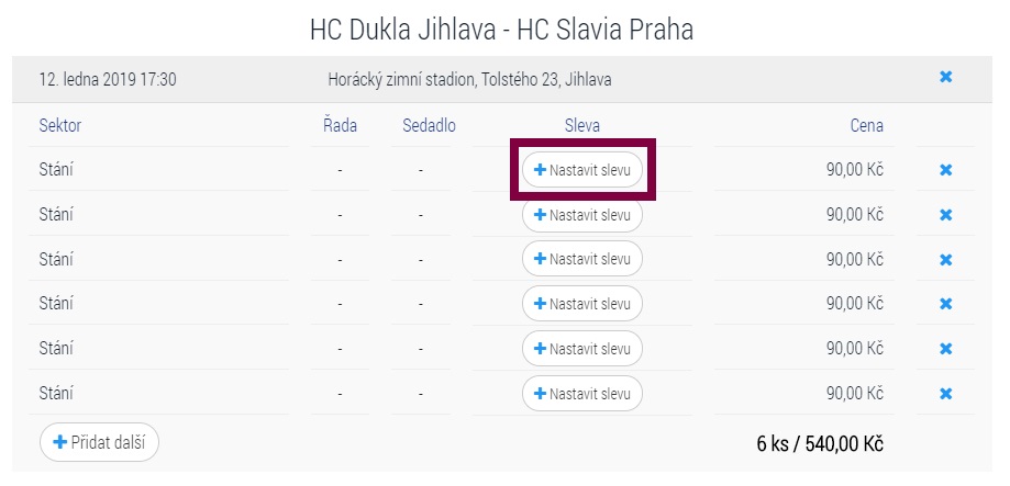 - Po vybrání sektorů a počtu lístků je možné v nákupním košíku označit slevu - pro děti na stání. Stačí kliknout na kulaté bílé tlačítko Nastavit slevu a potvrdit slevu "Dítě na stání"