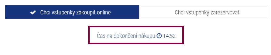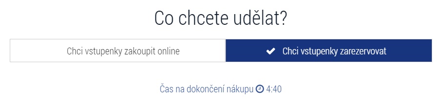 - Uživatel si poté může zvolit, zda si vstupenky rezervuje nebo zaplatí kartou online. Vstupenky je nutné zaplatit nebo zarezervovat nejpozději do 15 minut (viz. odpočítávání času).