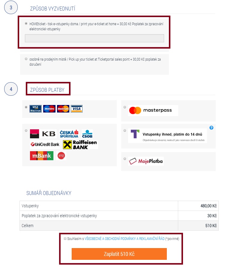 - V případě platby kartou je možné zaplacené vstupenky vytisknout doma (uživateli přijde e-mail s elektronickou vstupenkou k tisku). Služba HomeTicket je zpoplatněna 5 Kč.