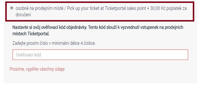 - Nebo vstupenky zaplatit a vyzvednout na některém z Prodejních míst Ticketportalu - tom případě musí uživatel zadat minimálně 4 číselný kód, který při vyzvednutí vstupenky řekne na prodejním místě. Příplatek za vyzvednutí zaplacených vstupenek na některým z prodejních míst Ticketportalu je 30 Kč, viz. obrázek