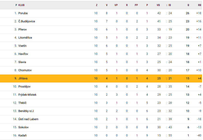 Venku prohra, doma výhra. Po následujících šest kol to nedokázal Frýdek zlomit. Domů tak jel s prázdnou z dalekého Sokolova, od jihlavského rivala z Třebíče, překvapivě nedokázal přehrát ani mátožné Ústí. Na druhé straně, náladu si pravidelně spravoval doma, nejprve přetlačil matný Prostějov, vypráskal Kadaň a po mohutném čtyřgólovém obratu ve třetí třetině udolal i Benátky nad Jizerou. Doposud poslední zápas sehráli Slezané na ledě pražské Slavie, od 17. minuty drželi jednogólové vedení, které však sešívaní během šesti minut třetí třetiny umazali a sami otočili ve svůj prospěch. Suma sumárum, společně s Porubou je na domácím ledě jediný doposud neporažený celek. S 13 body je Frýdek na průběžném 11. místě, na třetí Litoměřice ale v našlapaném středu tabulky ztrácí jenom šest bodů.