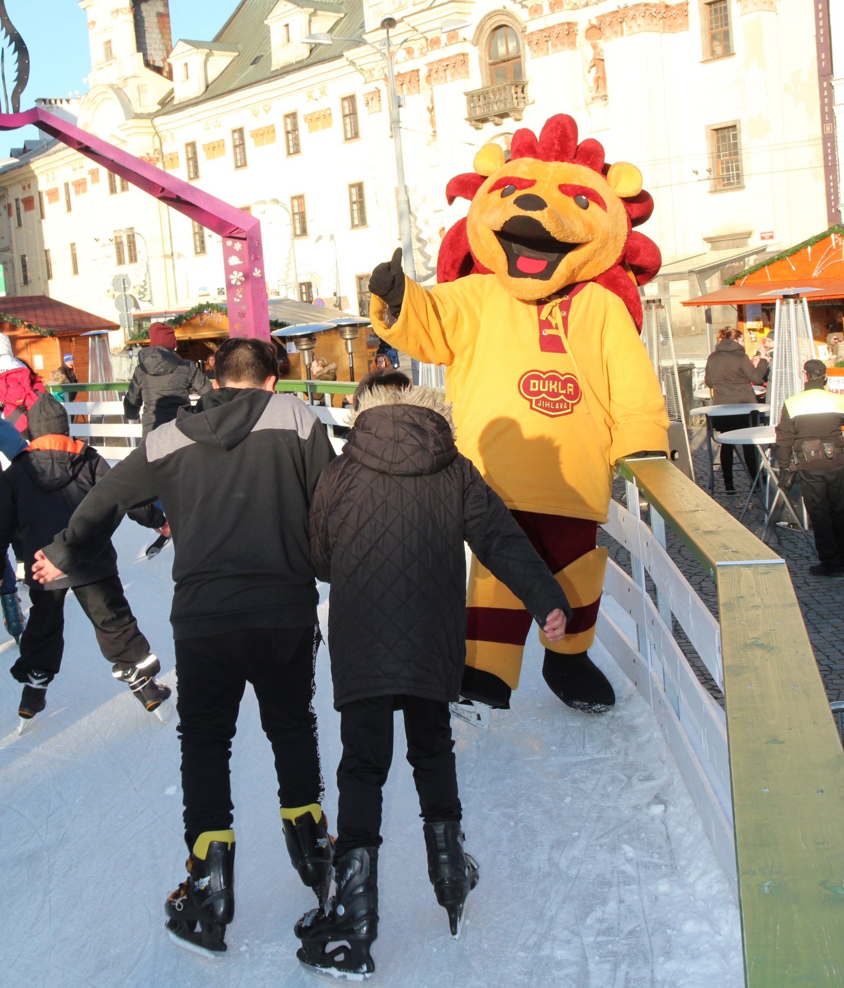 Ježek JD maskot Dukly bruslil na jihlavském náměstí