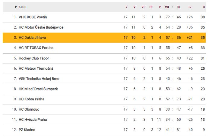 K naprosto jisté záchraně bez ohledu na cokoliv jiného potřebuje Dukla uhrát 12 bodů z 15 možných. Toto číslo bude ale reálně menší, neboť Vsetín, Motor České Budějovice, Jihlava, Tábor i Poruba nastoupí v několika zápasech vzájemně proti sobě. Červenožlutí nyní potřebují zvládnout sobotní 18. kolo nadstavby, kdy doma hostí Techniku Brno. Pokud jí porazí za tři body, již nemohou skončit v tabulce hůře než brněnský tým. Plný bodový zisk by měl být proti Technice jasným cílem, Jihlavu poté čeká těžký závěr nadstavby, kdy se utká se všemi svými přímými konkurenty od prvního do pátého místa a navíc hraje jen jednou doma (proti Vsetínu).