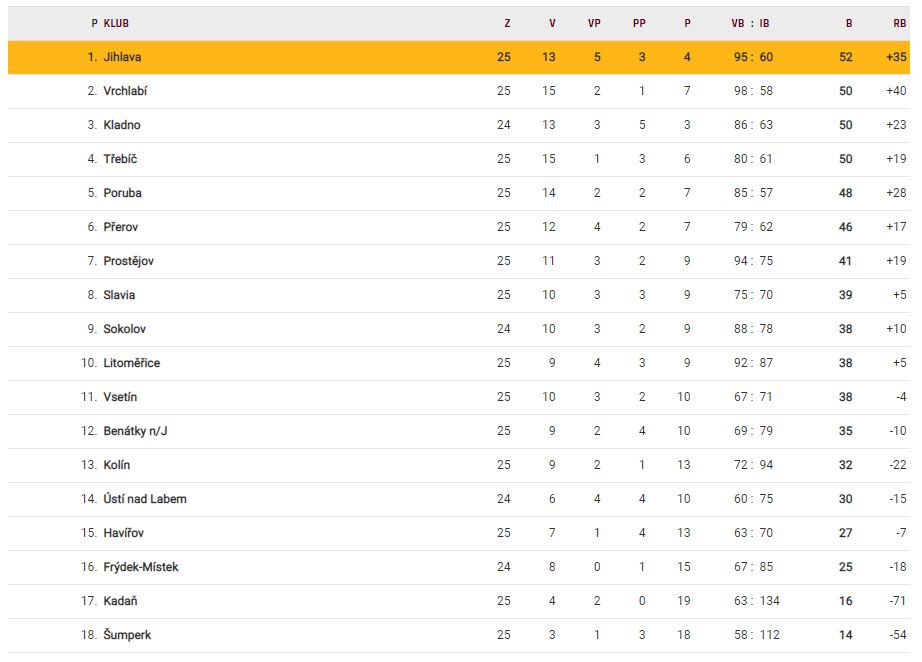 Po vzájemném utkání Dukla přišla o post týmu, jenž jako jediný doma neprohrál za nula bodů. Přerov vyloupil CZ LOKO Arénu výhrou 4:2. Jihlavští z dalších dvou zápasů získali 4 body, když vždy dokázali urvat bonusový bod (výhra nad Kladnem 4:3 na nájezdy a výhra na Slavii 4:3 v prodloužení). Zubři naopak výhru v Jihlavě nenapodobili na ledě Poruby a v Ostravě prohráli 3:5. Pondělní dohrávky nebo předehrávky se přerovských hokejistů netýkaly. Jihlava je nyní znovu první s 52 body ve 25 zápasech (2,08 bodů/utkání) a dvoubodovým náskokem před triem Vrchlabí, Kladno, Třebíč. Ale zatímco Stadion i Horácká Slavia mají odehráno stejný počet zápasů jako Dukla, Kladno má utkání k dobru (2,083 bodů/zápas). Pátá je Poruba (48 bodů) a o dva body zpět je Přerov. Středeční program Chance Ligy tak bude hodně zajímavý, neboť čtyři celky z první šestky se utkají proti sobě (Přerov – Jihlava, Vrchlabí – Kladno).