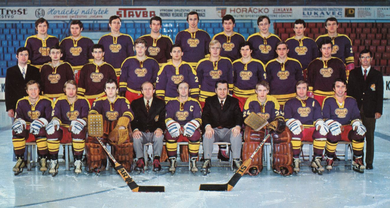 Mistrovský tým Dukly ze sezony 1973/1974. Miloš Novák je na fotografii v horní řadě čtvrtý zleva. Zdroj: Archiv Dukly Jihlava