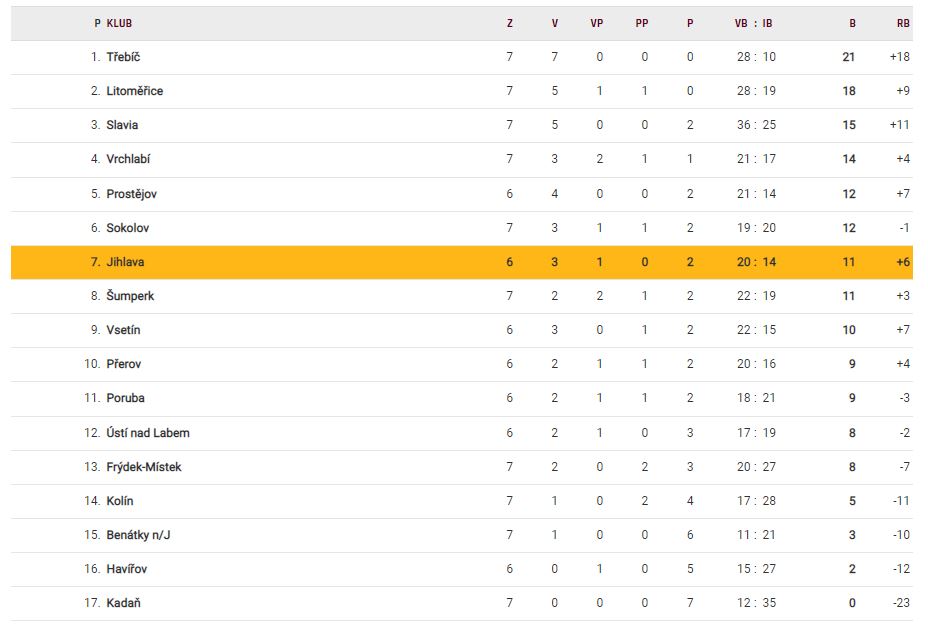 Pohled na tabulku Chance ligy je od úvodu soutěže stále stejný. Lídrem druhé nejvyšší české hokejové ligy je právě SK Horácká Slavia Třebíč, která v sedmi dosavadních zápasech neztratila ani bod a inkasovala jen deset branek. Dukla se po střelecké kanonádě na ledě Slavie (výhra 7:3) posunula už na sedmé místo a je druhá nejlepší z týmů, které už mají odehráno o zápas méně.