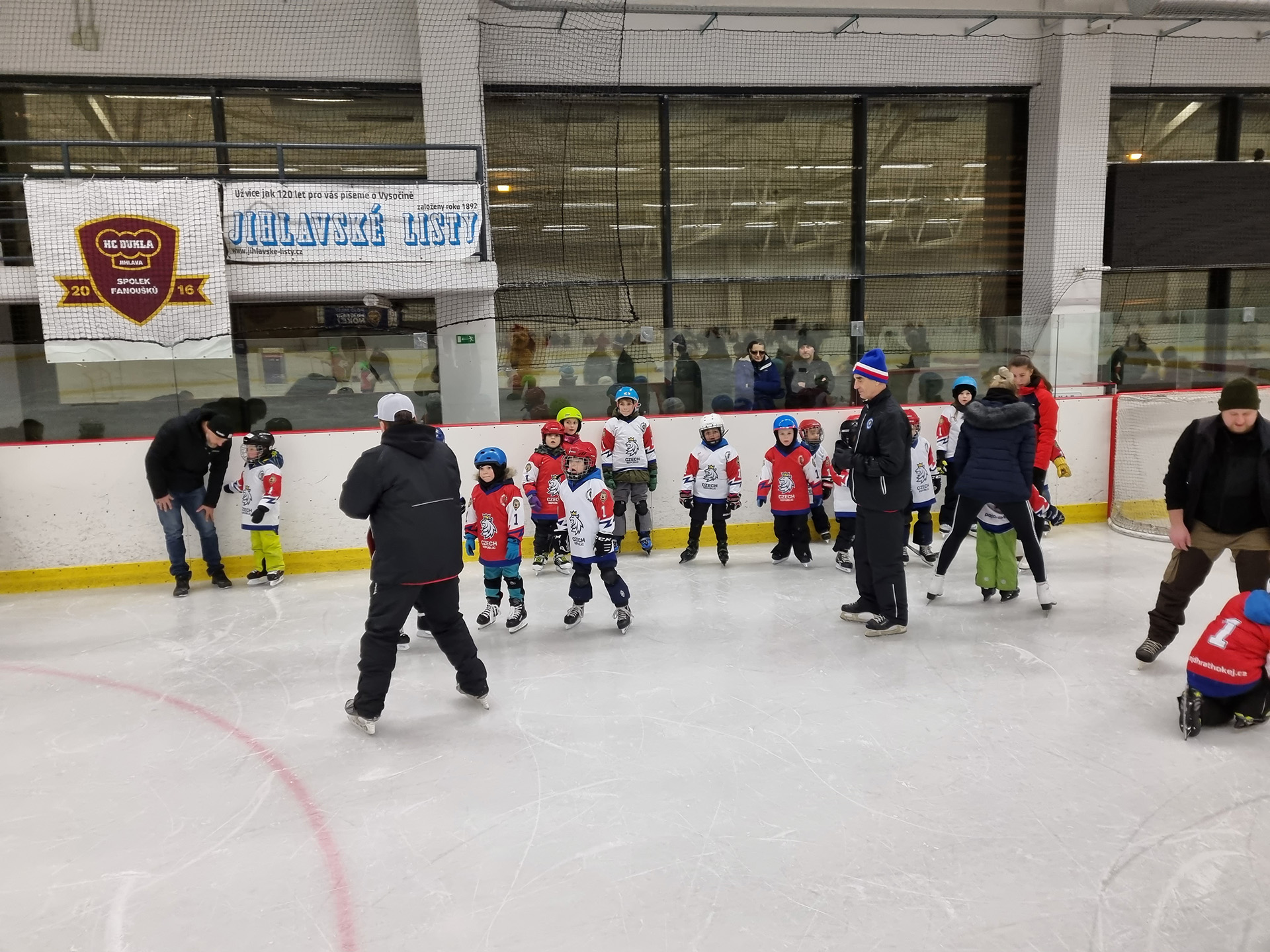 V 17:15 hodin se děti dočkaly vytouženého vstupu na ledovou plochu, kde se setkaly i s pár hráči z kategorie mladší přípravka 2014.