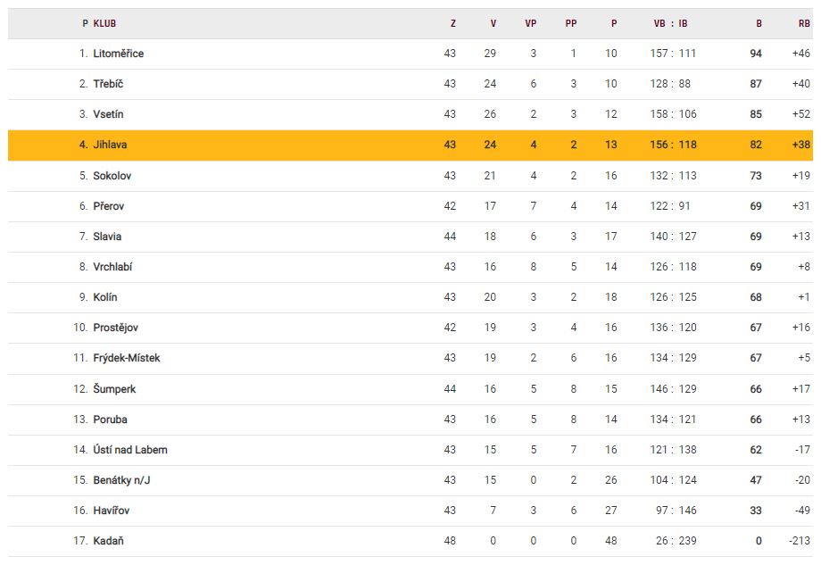 Frýdek-Místek proto nyní bude bojovat o první desítku, znamenající play-off. Je jedenáctý a z této pozice je jen dva body vzdálen šestému Přerovu, který drží poslední místo znamenající přímo čtvrtfinále. Závěr sezony tak bude na těchto pozicích extrémně těžký a každý získaný bod může mít cenu zlata! Opět připomeňme, že jedenácté a dvanácté místo sice už neznamená play-off, ale záchranu ano. Třináctý a čtrnáctý tým se utká v sérii play-down, přičemž poražený přímo sestoupí a vítěz musí do ošemetné baráže proti vítězi druhé ligy. Týmy ze středu i spodku tabulky, vyjma Benátek a Havířova, jedou na úplnou krev.
