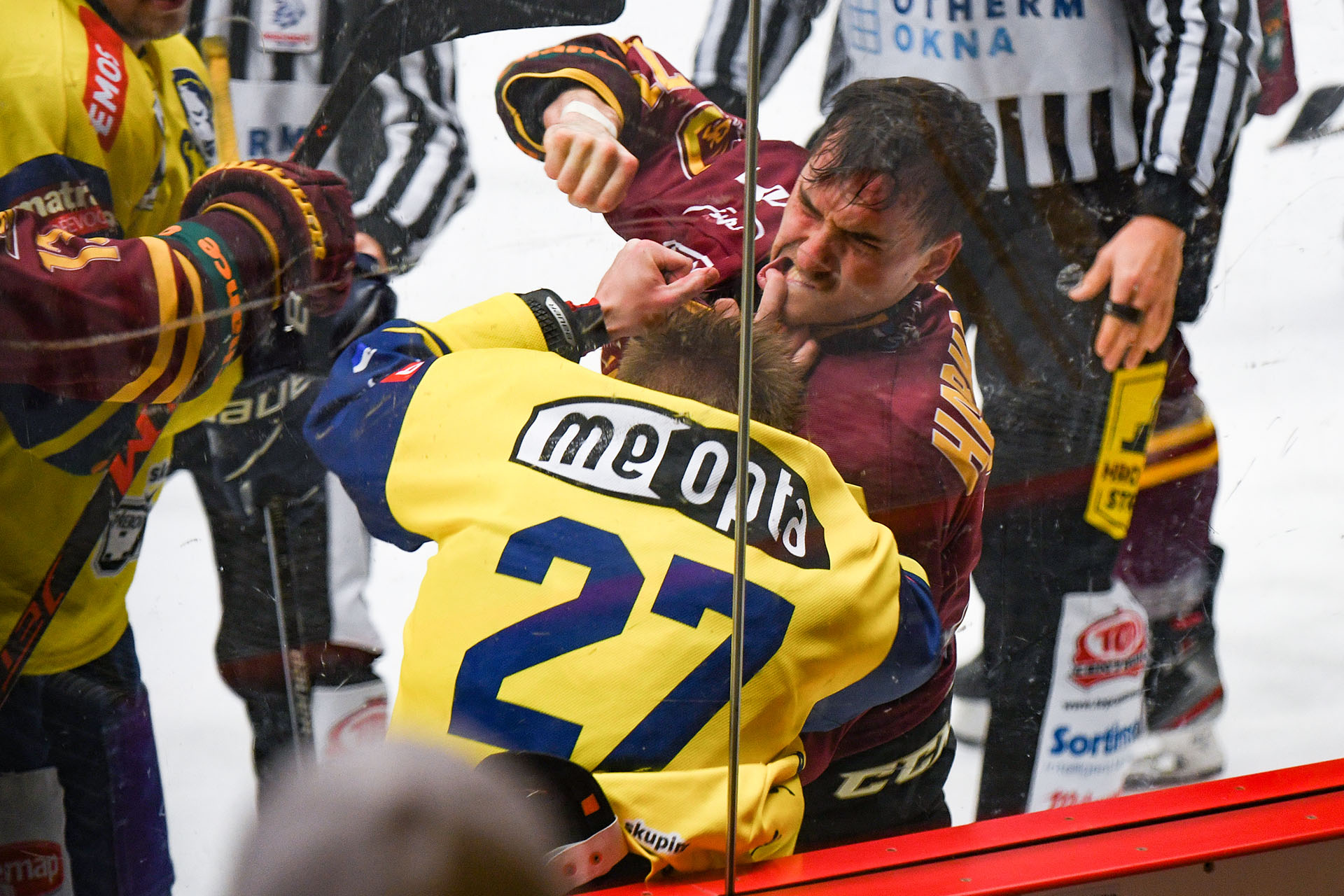 Konec druhé třetiny pátého čtvrtfinále byl velmi vyostřený. Do pěstní potyčky se pustil Tomáš Harkabus s Tadeášem Králem, poté si měli pořádně co říct Matouš Menšík s Tomášem Kudělkou a do hromadné strkanice se zapojili i oba brankáři. Třetí část hry už podobné vylomeniny nepřinesla, naopak padly dvě branky. Na 2:0 zvyšoval Vítězslav Brož a jeho trefa byla po snížení Šimona Kratochvíla rozhodujícím gólem. Foto: Markéta Křížová
