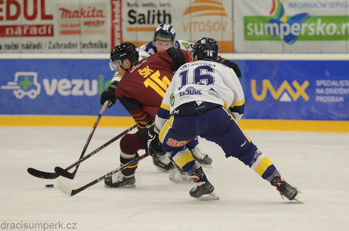 V sobotu bude v Pelhřimově k vidění souboj týmů, jenž loni hrály baráž. Zatímco Dukla se neúspěšně rvala v té extraligové o postup do nejvyšší soutěže proti Kladnu, Šumperk naopak hájil Chance ligu proti Táboru. A vlastně i to odpovídá tabulkovému postavení obou celků. Po těžkém začátku, kdy Jihlava prohrála třikrát po sobě, si první výhru zapsala právě proti Drakům a nyní, po šesti výhrách z posledních sedmi zápasů, jí patří druhé místo tabulky. Šumperk ale také zabral, v sedmi předešlých zápasech čtyřikrát vyhrál a nebodoval jen ve dvou případech. Přesto jsou Draci stále oblíbeným celkem jihlavských hokejistů. Z posledních šesti zápasů ztratili Jihlavští proti Šumperku jen jeden bod za výhru na nájezdy.