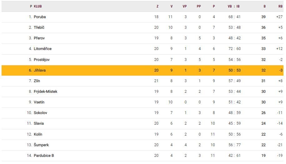 Ve stále poměrně vyrovnané tabulce patří Sokolovu desátá pozice se ziskem 26 bodů a bilancí osmi výher (jedné za dva body) a jedenácti porážek (tří za bod). Dílčím problémem týmu velký počet inkasovaných branek – 59, protože jen tři týmy jsou v tomto ohledu horší než Sokolovští. Ty také trápí domácí zápasy, jelikož se ziskem 13 bodů doma ze sedmadvaceti možných se řadí až na předposlední místo v tabulce (Jihlava je na tom „doma“ pouze o dva body a o tři příčky lépe). Z tradičního okénka statistik je třeba vyzdvihnout Jaromíra Kverku, který je nejlepším střelcem i jasně nejlepším nahrávačem týmu (7+16). V obraně hraje prim ex-jihlavský bek Jan Pohl, který čtyři branky dal a na dalších devět nahrál. Jen o asistenci méně má útočník Matěj Zadražil, jenž předešlé dva roky strávil v Jihlavě a letos naskočil již do čtyř zápasů v extralize za Karlovy Vary. Kratší či větší vzpomínky na Duklu mají i útočník Martin Osmík nebo brankář Vladislav Habal.