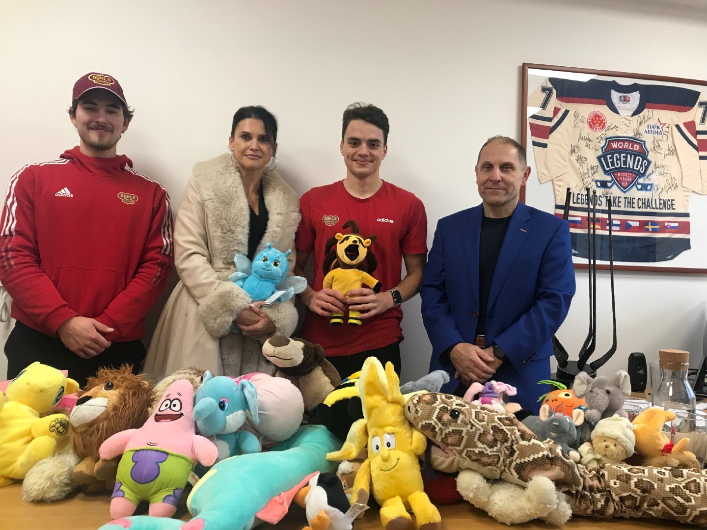 Nemocnici Havlíčkův Brod předávali plyšáky Adam Dvořák a Richard Cachnín, oba spojeni s havlíčkobrodským hokejem.