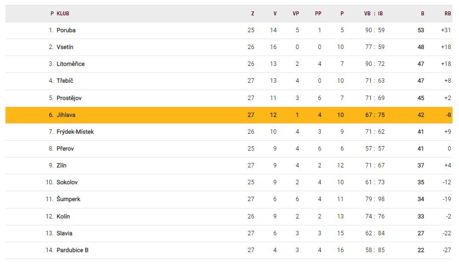 Jak bylo řečeno, ve vyrovnané tabulce od sebe oba celky dělí pouze jeden bod. Frýdek-Místek doposud nasbíral 41 bodů za čtrnáct výher a dvanáct porážek (tři za bod), Dukla má o zápas více a také o bod více za třináct vítězství a čtrnáct proher (čtyři za bod). Stále platí, že vyjma uskočené Poruby dělí druhý Vsetín od osmého Přerova jen sedm bodů, takže tabulkové pořadí se může měnit každým kolem. Z tohoto pohledu je škoda každých ztracených bodů. Výrazně více ale Duklu mohou mrzet absence, k dlouhodobě zraněným útočníkům Tomáši Havránkovi a Filipu Semanovi se bohužel přidal Otakar Šik. Dá se tak čekat, že do Frýdku-Místku pojede Dukla s posíleným kádrem.