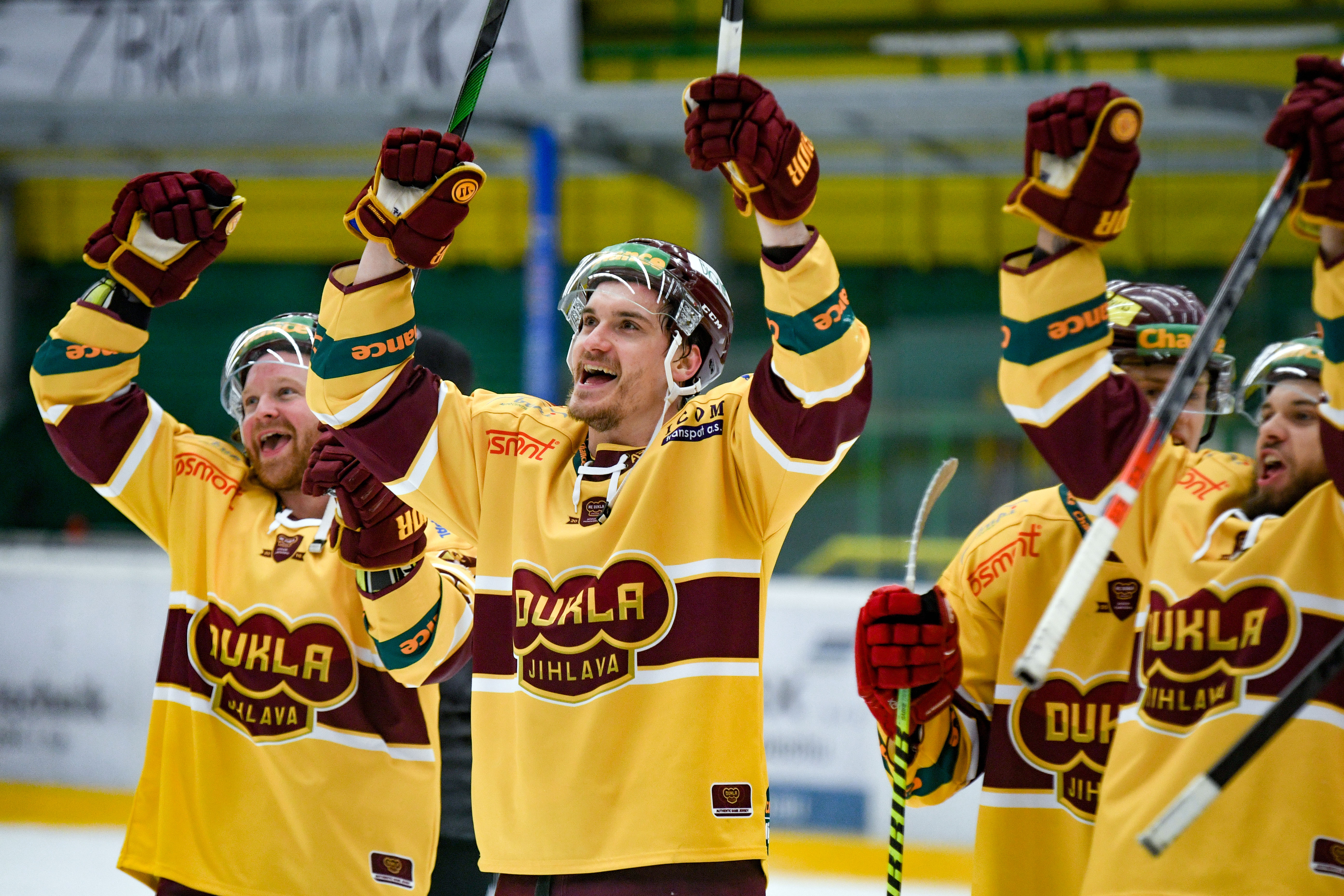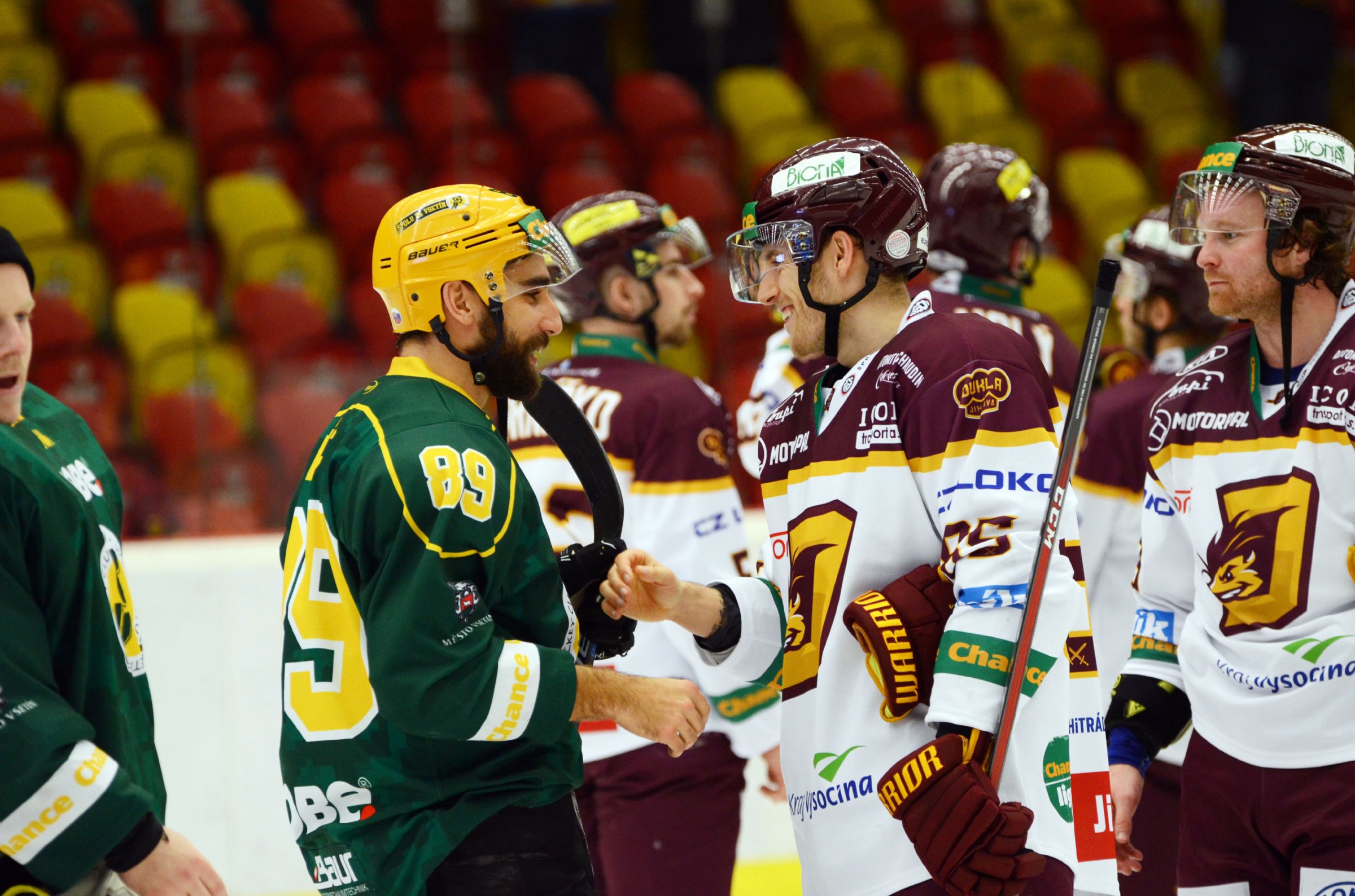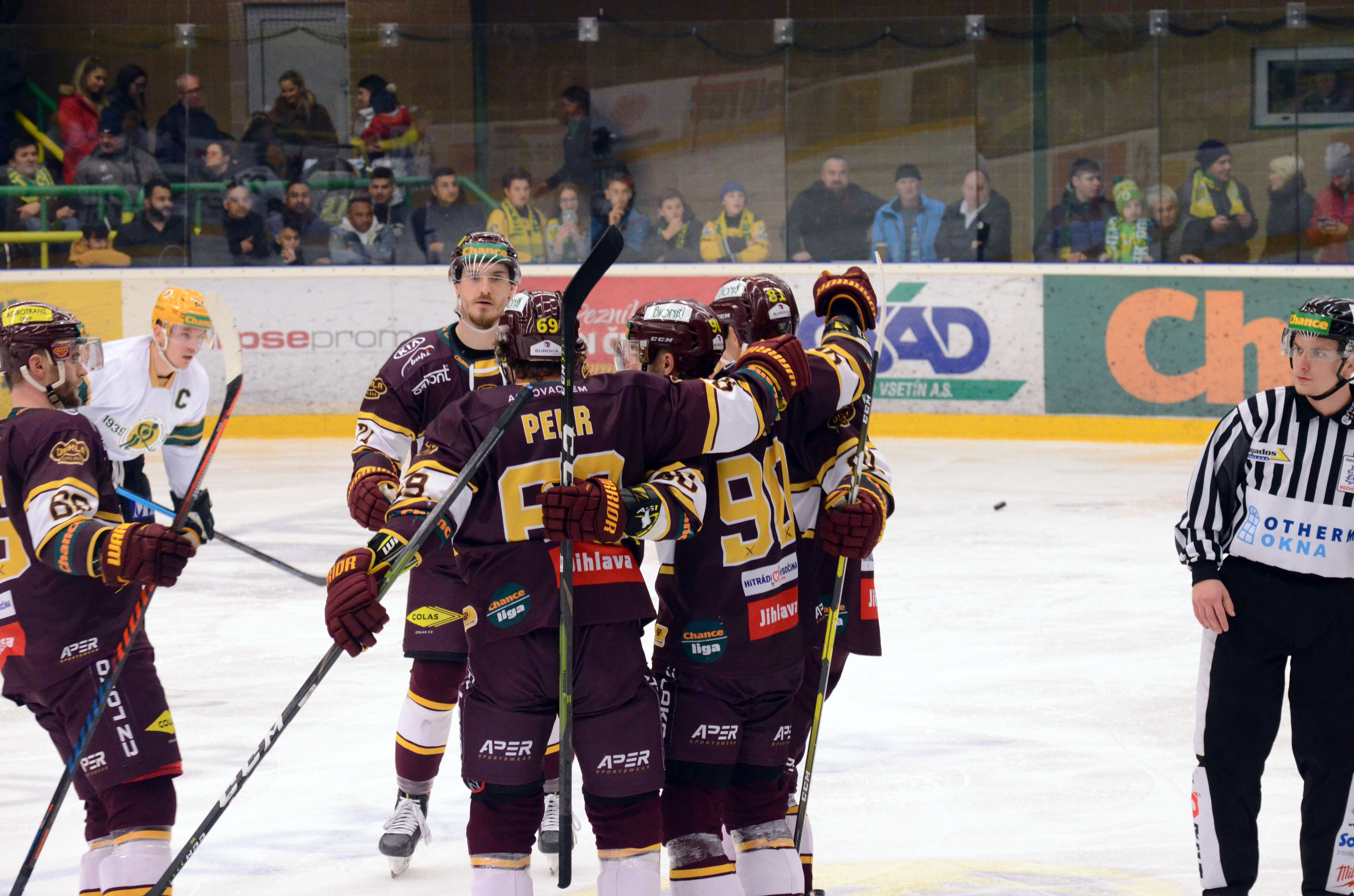 V sezoně 2018/19 se střetli po dlouhé době bývalí extraligoví soupeři. Všechny čtyři zápasy ovládl Vsetín, tři z nich se definitivně rozhodly v závěru. Vsetín na snímku oslavoval výhru 3:2 v CZ LOKO Aréně. Autor: Markéta Křížová