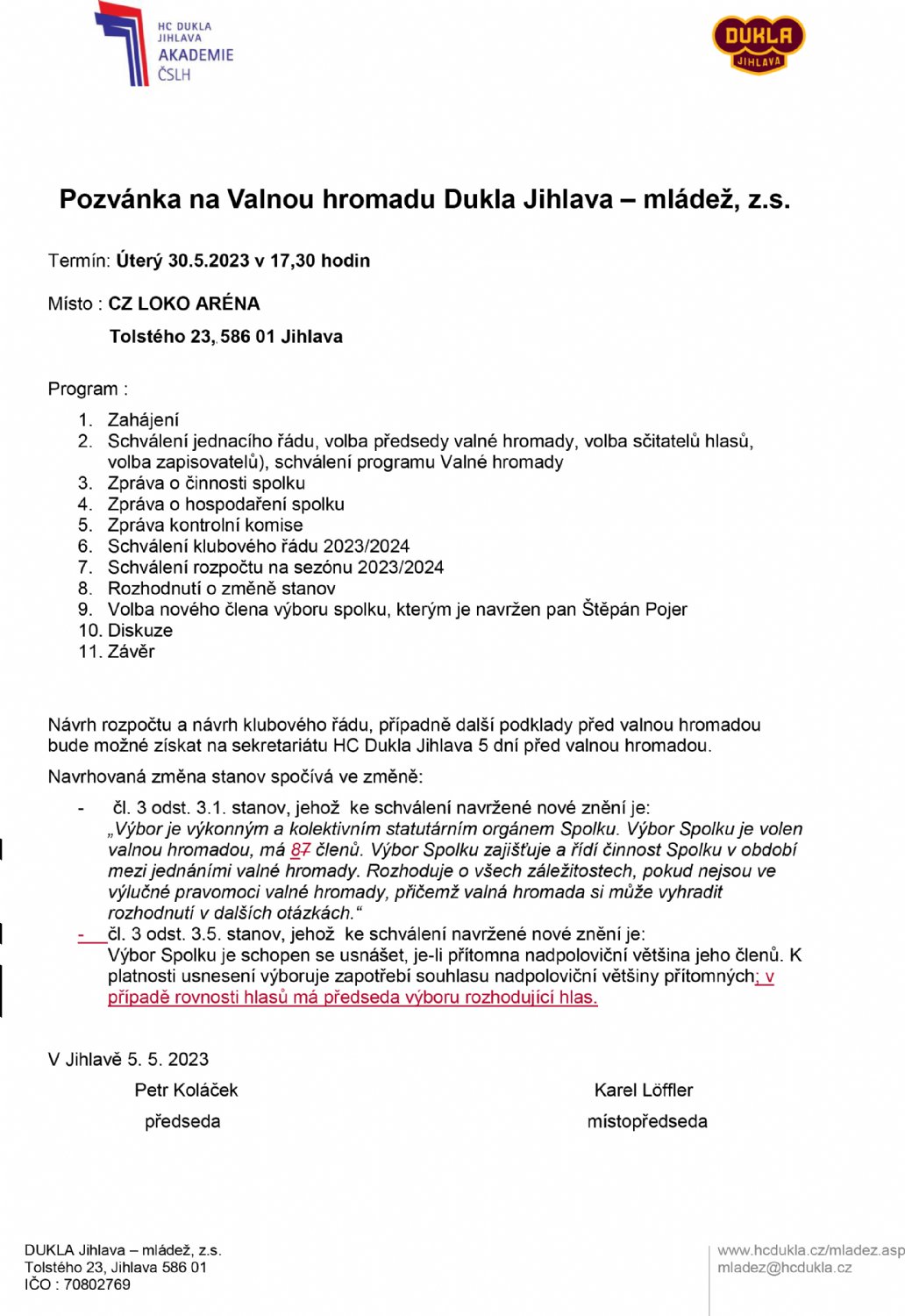 Předseda výboru mládeže Petr Koláček svolává řádnou valnou hromadu spolku Dukla Jihlava – mládež, z.s. Ta se uskuteční v úterý 30. května 2023 v 17.30 hodin ve Veřejném sportovišti pro lední sporty v Tyršově ulici v Jihlavě (malý zimáček).