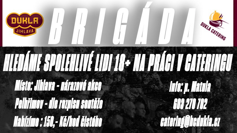 Dukla Catering hledá spolehlivé posily do svého týmu. Jedná se o práci v občerstvení během jednorázových akcí v Jihlavě a zápasů Chance ligy v Pelhřimově. Brigáda je určena pouze starším 18 let. Nabízíme 150 Kč/hod. čistého. Případní zájemci prosím pište p. Matulovi na email catering@hcdukla.cz nebo volejte na 603 270 702.