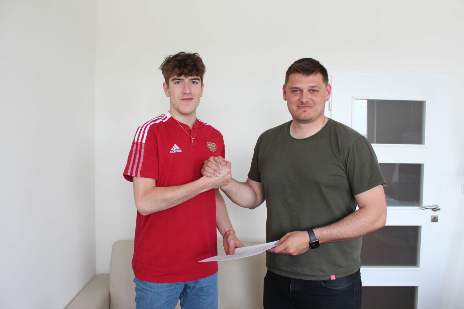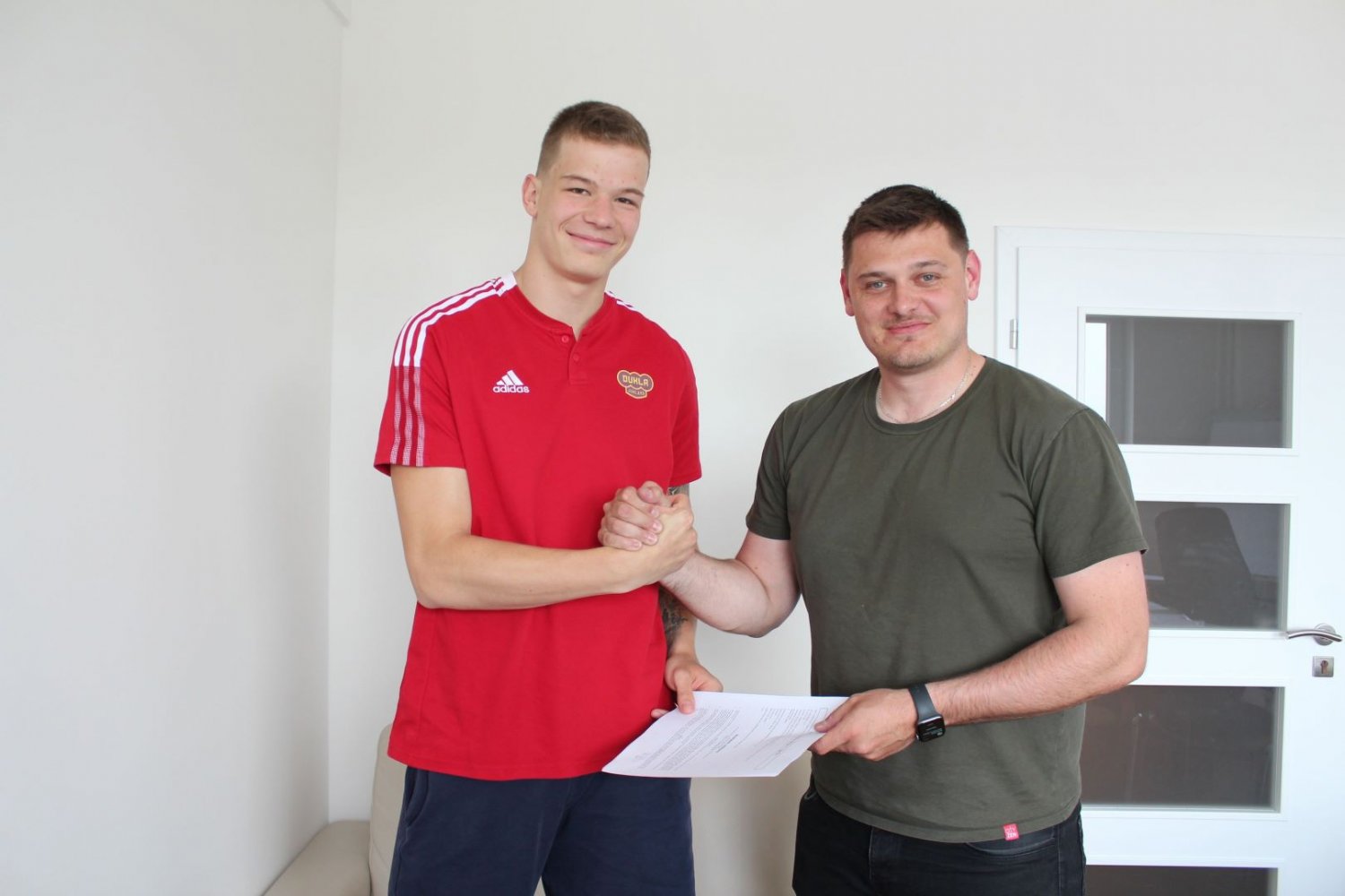 Lukáš Číhal a Šimon Báťa při podpisu smlouvy se sportovním manažerem Tomášem Vrábelem.