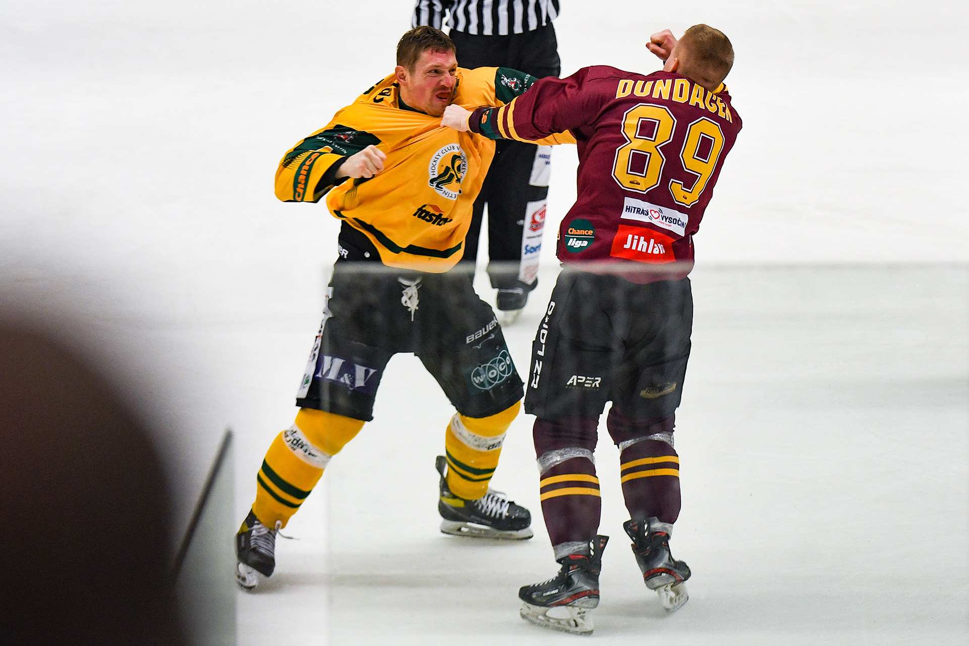 Jan Berger vyzval na pěstní souboj svého budoucího spoluhráče Filipa Dundáčka během čtvrtého finále v sezoně 2021/22. Foto: Markéta Křížová