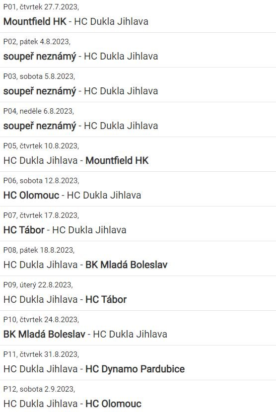 První přípravný zápas juniorů by se měl hrát ve středu 2. srpna, kdy Dukla zajíždí na led Komety. V rychlém sledu během dalších dvou dnů přijdou na řadu venkovní zápasy s Českými Budějovicemi a se Spartou. Hned v dalším týdnu hostí hráči trenérů Michala Broše a Mariana Moravy celky Sparty a Komety. V polovině srpna odjíždí na turnaj do Vítkovic, kde vedle pořádajícího týmu a Dukly bude hrát i Nitra, Polsko U-20 a Schwenningen. Generálku na novou sezonu sehrají junioři ve čtvrtek 17. srpna proti Českým Budějovicím.