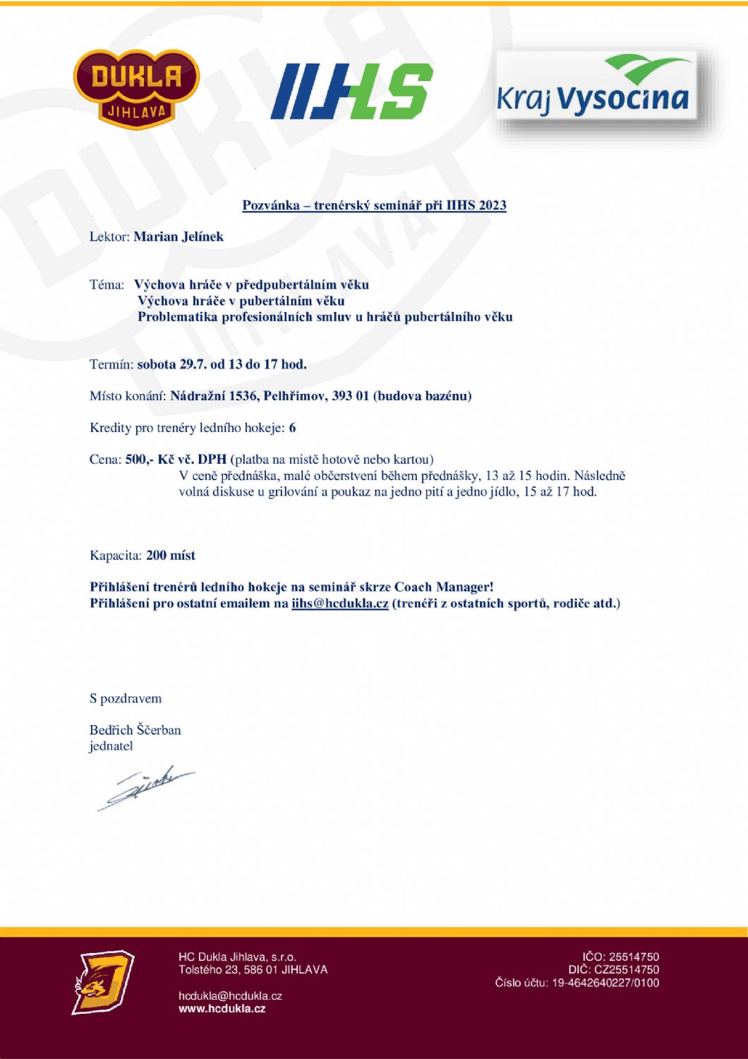 Mezinárodní hokejová škola kromě samotného kempu pro nadějné hráče tradičně nabízí i řadu dalších aktivit pro trenéry i širokou hokejovou veřejnost. Letošní ročník nabídne zajímavý seminář od vyhlášeného trenéra, lektora a mentálního kouče Mariana Jelínka na téma výchovy hráčů pubertálního věku a problematiky smluv hráčů v tomto věku. Seminář proběhne 29. července od 13 do 17 hodin v prostorách plaveckého bazénu v Pelhřimově. Vstupné na seminář je 500 korun, trenéři mimo hokejové prostředí a zájemci z řad veřejnosti se mohou přihlásit na emailu: iihs@hcdukla.cz.