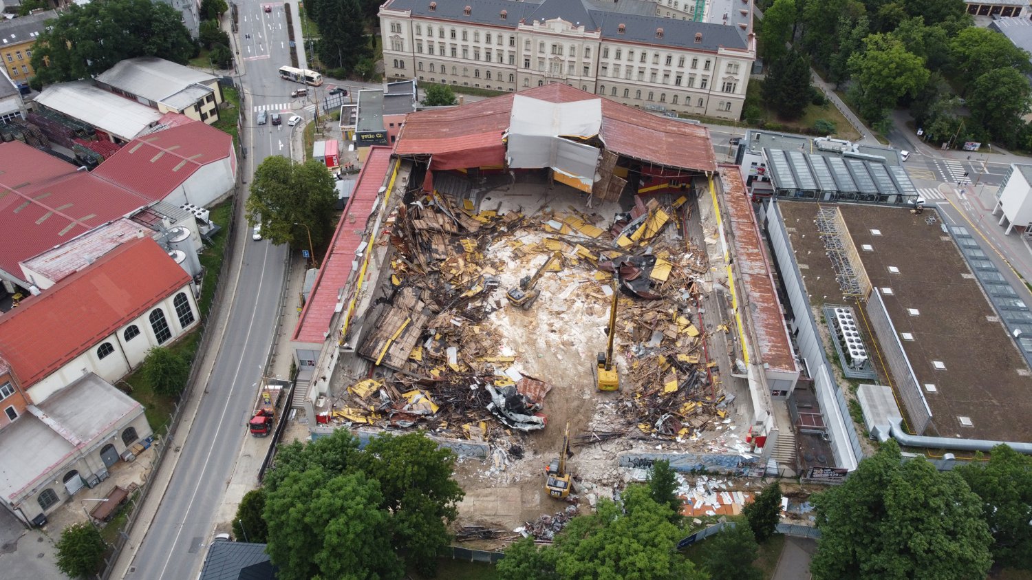 „Byly nějaké obavy, jak se bude střešní konstrukce chovat, ale strojník to zvládl dobře a všechno šlo rychle,“ řekl pro HZStv1 Ing. Petr Kráčmar, manažer projektu. Během demolice na bývalé ledové ploše skvěle spolupracují bagry, které třídí veškerý zbouraný materiál. „Jak jsme předesílali, máme na ploše čtyři velké bourací bagry, které jednak bourají konstrukce a třídí. Jezdí nám sem kontejnery na odvoz odpadu a třídění budeme posilovat malými stroji, jako jsou minirýpadla a smykově řízené nakladače,“ dodal manažer projektu s tím, že jako první bude demolována podlouhlá stěna od malého zimáčku.