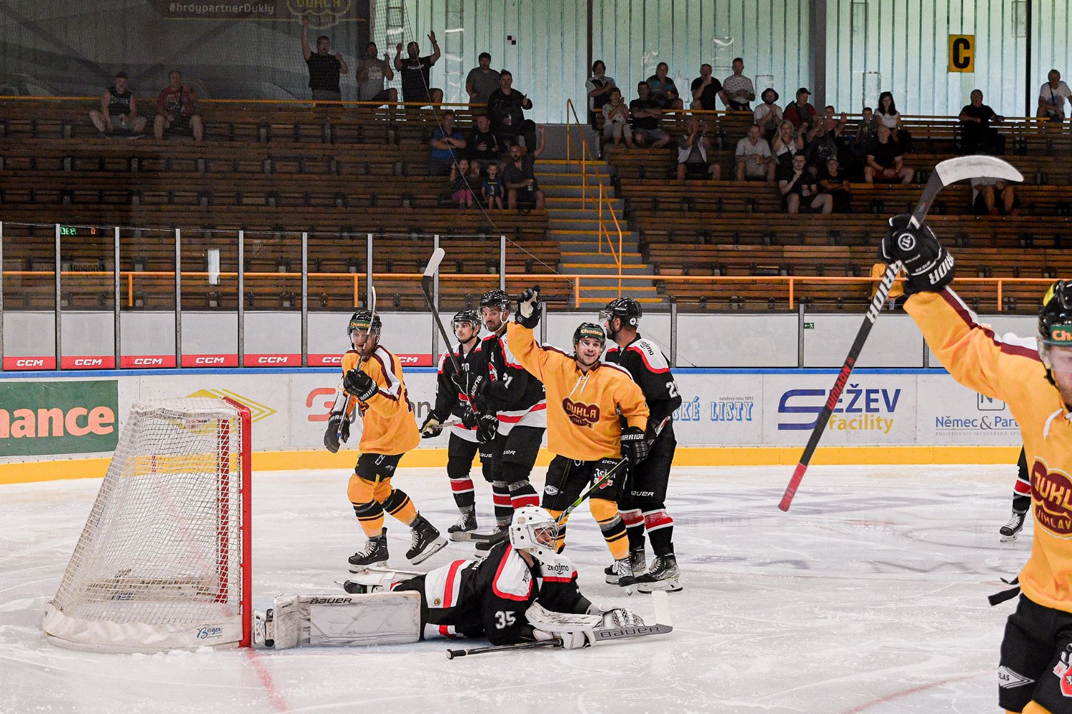 První vzájemný zápas v Pelhřimově nabídl hokej plný gólů. Dukla v tomto utkání byla zatím nejproduktivnější z celé přípravy, Znojmu vstřelila hned šest gólů. Foto: Barbora Stránská