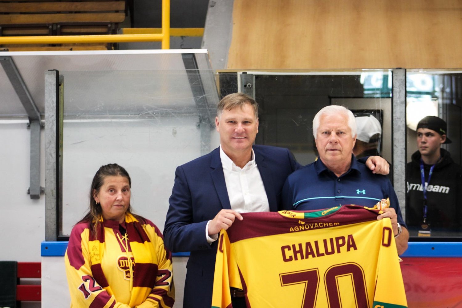 Předání dresu se symbolickým číslem 70. Na začátku zápasu s Frýdkem-Místkem Dukla Jihlava dodatečně blahopřála velké legendě klubu Milanu Chalupovi, který 4. července oslavil právě sedmdesáté narozeniny. Chalupa od roku 1973 působil v Dukle a hned během svého prvního roku v týmu mohl slavit titul. V 80. letech minulého století se pak podílel na dalších třech titulech Jihlavy během druhé zlaté éry klubu. Díky dobrým výkonům se probojoval až do NHL, kde odehrál jednu sezonu. Milan Chalupa byl mimořádně úspěšný nejen na klubové, ale také na reprezentační úrovni. Dvakrát mohl slavit stříbrné medaile na olympijských hrách a na mistrovství světa vybojoval hned sedm medailí, z toho dvě nejcennější. V roce 2010 byl uveden do síně slávy Českého hokeje.