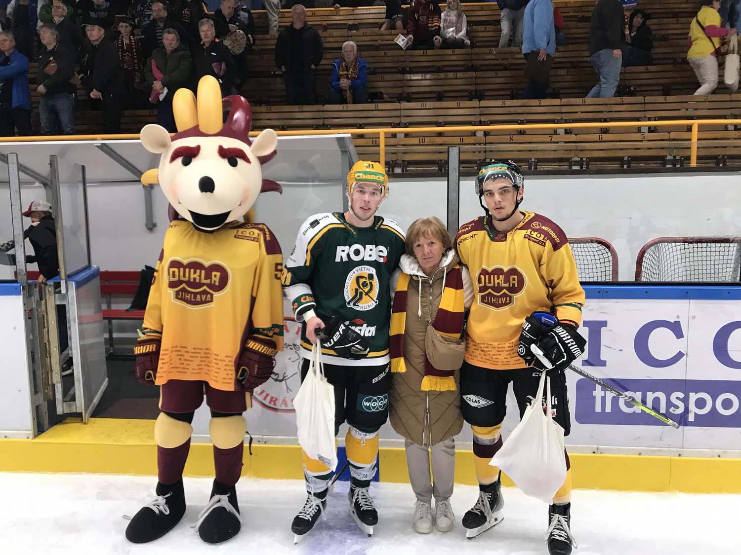 Marie Balogová předávala ceny pro nejlepší hráče zápasu. Zleva vsetínský Tomáš Jandus, napravo jihlavský Richard Cachnín. Foto: Petr Palovčík