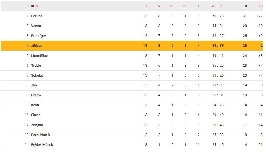 Zdá se, že jihlavští hokejisté jsou po třech výhrách v řadě venku z menší krize, která je začátkem října potkala. Dukla tehdy prohrála čtyři z pěti utkání a inkasovala v nich 22 branek. To už je naštěstí minulostí. Během třech výher s plným počtem bodů totiž inkasovala pouhé dvě branky při skóre 7:2 a proti Zlínu udržel gólman Adam Beran svou první nulu v sezoně, celkově pak druhou v červenožlutém dresu. Jihlavě nyní patří čtvrté místo s 25 body a stejným bodovým ziskem, jako má třetí Prostějov. Jen tři body ztrácí Dukla na druhý Vsetím ztrácí jen tři body. První Poruba má o další tři body více.