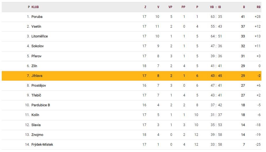 V posledním utkání na ledě Vsetína sice Dukla odešla poražena výsledkem 1:2, nic to však nemění na tom, že z krize se vyhrabala pěti výhrami v posledních sedmi zápasech. V kontextu celé Chance ligy je ustřelená zejména první Poruba se ziskem 41 bodů, druhý Vsetín je o čtyři body zpět. Poté už opět následuje pořadí měnící se každým zápasem. Třetí Litoměřice mají 33 bodů a devátá Třebíč 27 bodů. A následuje poměrně velká ztráta týmů, které se musí zvednout, jinak budou bojovat pouze o poslední volné místo pro předkolo a o holý sestup. Mezi Třebíčí a desátými Parbubicemi je po sedmnácti kolech rozdíl poměrně velkých devíti bodů. Inu, v Chance lize se začíná přiostřovat a doby, kdy jeden tým vedl o 15 bodů a pozice na první čtyřce byly jasné dlouho dopředu, jsou minulostí.