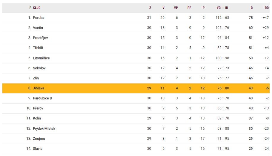 Jihlavští hokejisté šli do posledního kola proti Vsetínu posilnění třemi výhrami v posledních čtyřech zápasech, jenže proti Valachům jistě nepodali výkon, který by si sami přáli. Bez vstřelené branky se vyhrát nedá a těžko se získávají i body. Vsetínští se naopak trefili dvakrát a brali tři body. Ani Třebíčští nevstoupili do zápasového rytmu po repre pauze úspěšně, na ledě dalekých Litoměřic totiž prohráli 3:5. Zapsali tak druhou porážku za sebou, předtím totiž prohráli doma s jasným lídrem z Poruby 2:3 na nájezdy. Mrzet je to ale úplně nemuselo, jelikož dalších pět zápasů zpět vyhráli za plný počet patnácti bodů.