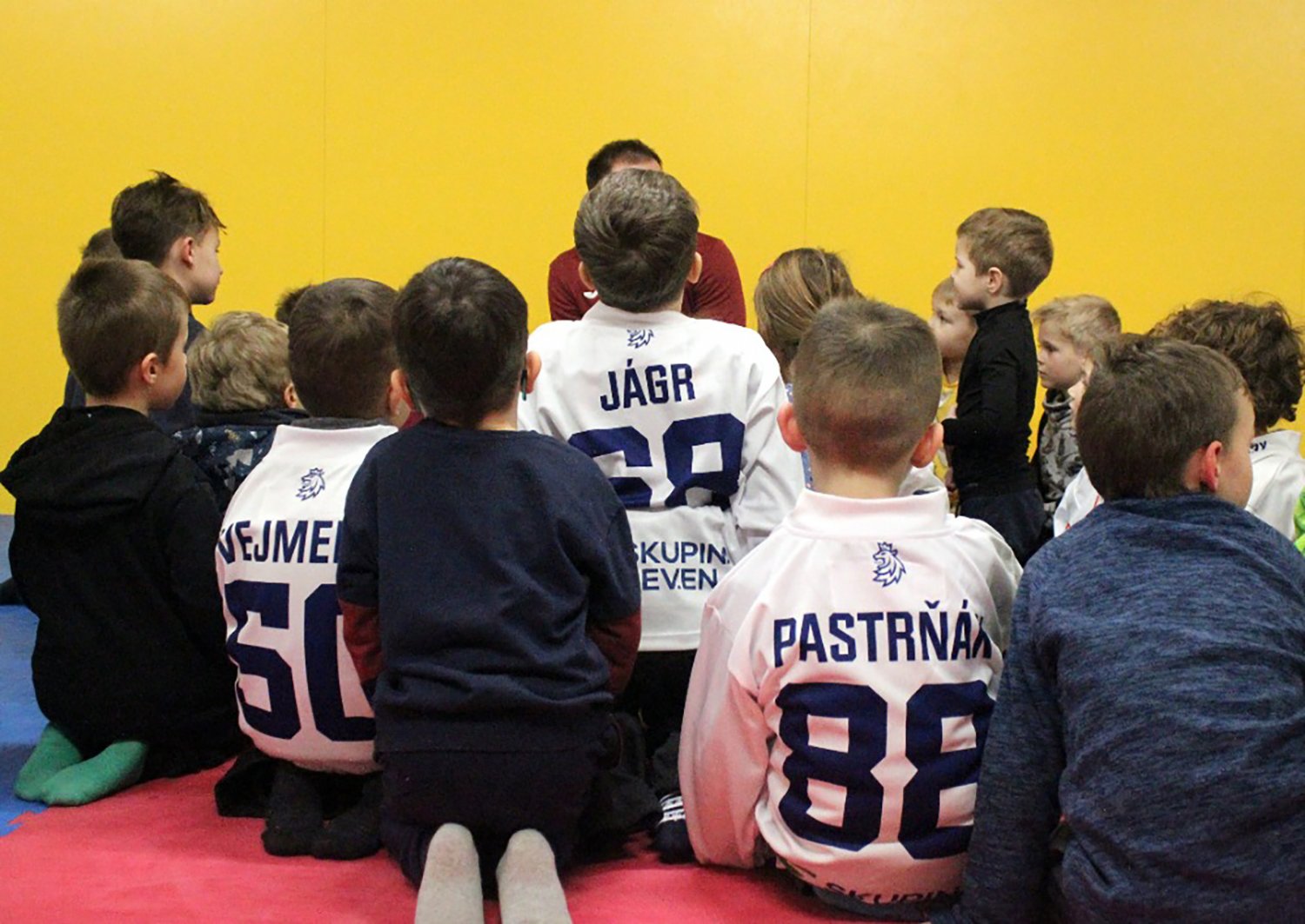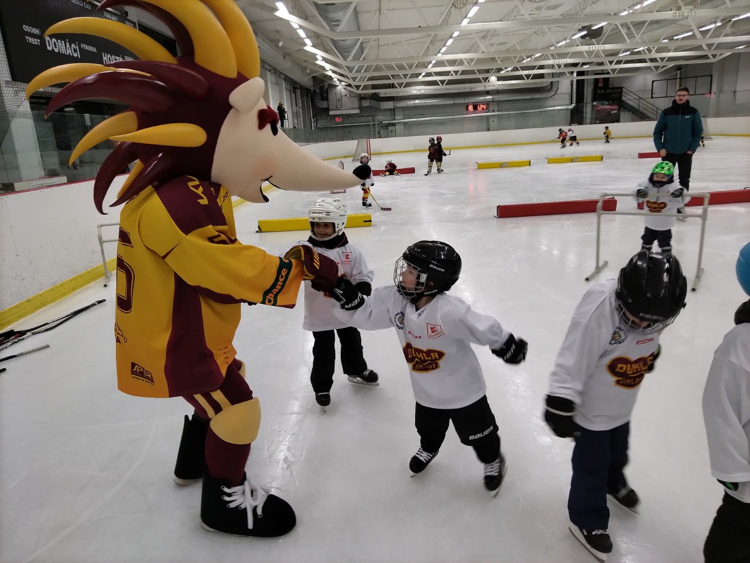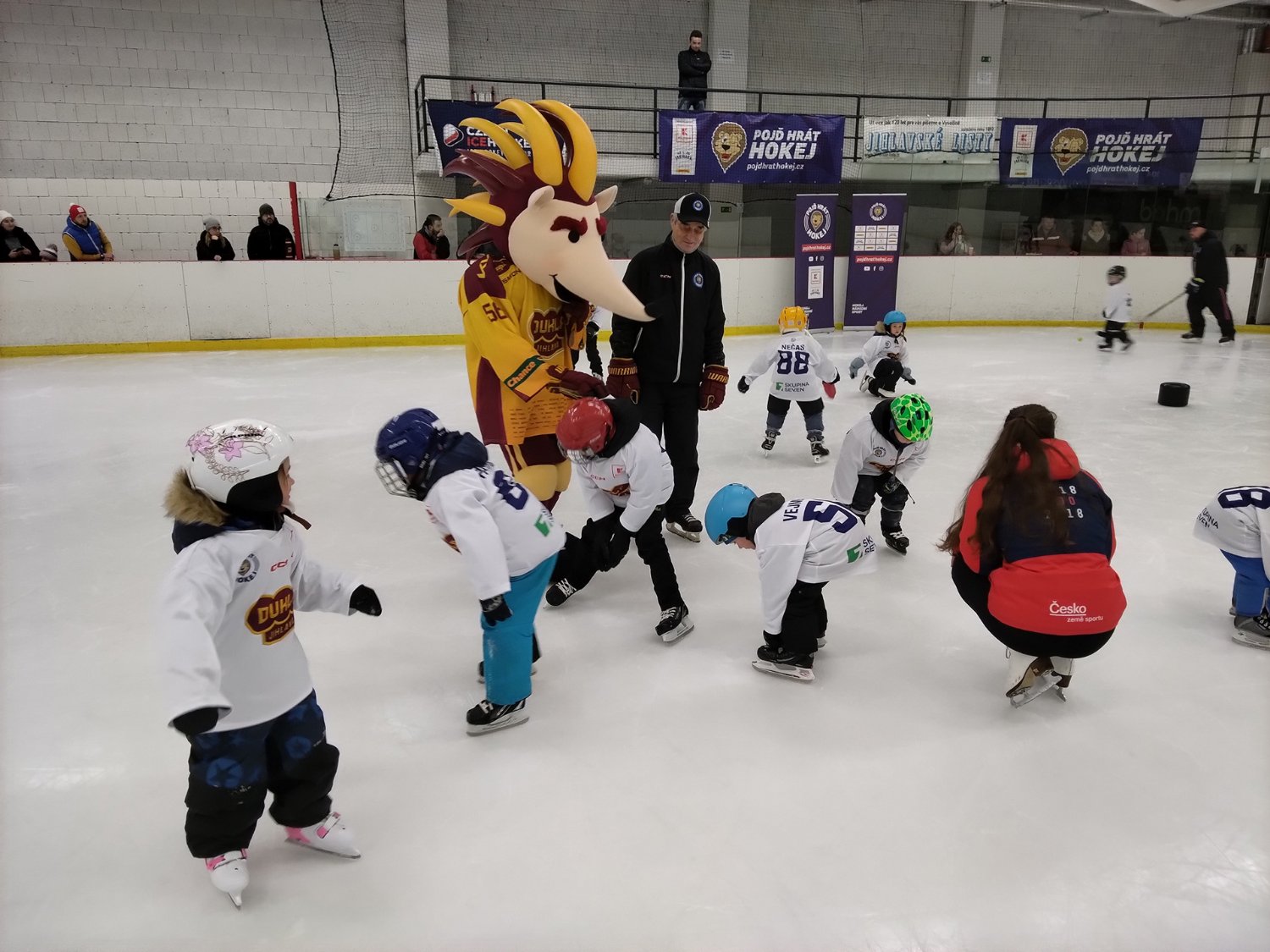 Děti během prezentace pro rodiče absolvovaly s kondičním trenérem předzápasovou rozcvičku, především hru na různá zvířátka. V 17:15 hodin se děti dočkaly vytouženého vstupu na ledovou plochu, kde se setkaly i s pár hráči z kategorie základny.